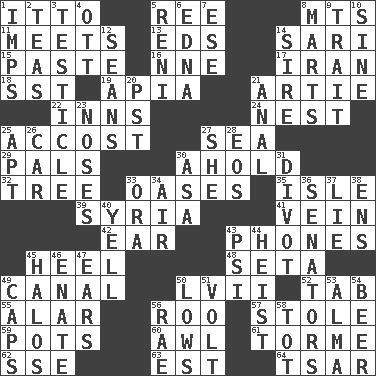 ACROSS 1. "Tell ____ the Marines!" 5. To riddle 8. Mountains (abbr.) 11. Confronts 13. Begley and Asner 14. Indian skirt 15. Thick mixture 16. Compass dir. 17. SW Asia republic 18. Fast jet (abbr.) 19. Capital of Western Samoa 21. Nick name for Arthur 22. Restaurants 24. A home for chicks 25. Buttonhole 27. Ocean 29. Friends 30. Hold, grip (Informal) 32. Relationship diagram 33. Fertile tracts in a desert 35. Capri or Wight 39. Damascus' land 41. Distinctive style or manner 42. Ewer handle 43. Gives a jingle 45. Person who is morally reprehensible 48. Bristle 49. Lessep's creation 50. 57 in ancient Rome 52. Bar bill 55. Having or resembling wings 56. Friend of Pooh 57. Fur scarf 59. Cooking vessels 60. Leather borer 61. Singer Mel 62. Compass dir. 63. Eastern Standard Time (abbr.) 64. Russian ruler of old DOWN 1. Naughty children 2. Beverages made from leaves 3. One of the two male reproductive glands 4. Baseball player Mel 5. Painter Guido (1575-1642) 6. Pulitzer Prize-winning author Ferber 7. Compass dir. 8. Shops 9. Distinguishing feature 10. Trig term 12. Actors Connery and Penn 14. Title for a man of rank and authority 20. Pacific Standard Time (abbr.) 21. Of or related to the anus 23. Olfactory organs 25. Fitting 26. Automobile 27. A female animal or person 28. Greek goddess of the dawn 30. White ___ sheet 31. A piece of turf (Scot.) 33. Mouth or opening 34. Atmosphere 36. Legislators 37. Untruth 38. Followers of ems 40. Shout 43. Air pressure measure (abbr.) 44. Robbery 45. Auras 46. Related on the mother's side 47. Hearing organs 49. Smile enhancers 50. Coldest temperatures 51. Electrical Unit 53. _ mater 54. Fermented drink made from hops 56. Actress Charlotte 58. Small child
