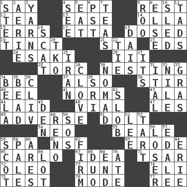 ACROSS 1. Declare 4. Back-to-school mo. 8. Repose 12. Afternoon social gathering 13. Relaxation 14. Rounded earthenware pot or jar 15. Blunders 17. Singer James 18. Administered medicine 19. A color or tint 21. R.R. building 23. Begley and Asner 24. 1973 Nobel Price Winner (Physics) Leo 26. One more than two 28. Torque (variant) 30. Inhabiting a nest 34. English channel? 37. In addition 39. Tumult 40. Snakelike fish 41. Typical models 43. In the manner of 44. Put down 46. Small bottle 47. French article 48. Contrary to your interests or welfare 51. Stupid person 54. Modern: prefix 55. Memphis, Tenn. Street 58. Health resort 61. Overdraft (abbr.) 63. Eat (away) 65. Monte _, Las Vegas Hotel/Casino 67. The content of cognition 71. Russian ruler of old 72. Margarine 73. The smallest animal of a litter 74. Connecticut Ivy Leaguer 75. Trial 76. Method 77. To riddle DOWN 1. Proofreading order 2. Nest on high 3. Entertaining tales 4. Observe 5. Erode 6. Pacific Standard Time (abbr.) 7. Beverages made from leaves 8. Friend of Pooh 9. Otherwise 10. Downhill vehicle 11. Small amounts or degrees 16. Scram! 18. Raised platform 20. Ring climax 22. Make a knot 25. SW Asia republic 27. ___ a Wonderful Life 29. Garlic unit 30. Wanderer 31. Slanted text style (abbr.) 32. "Death on the ____" 33. Pate de foie ____ 34. Actor Lugosi 35. Necklace unit 36. 154 in Roman numerals 38. Indian title of respect (Mr.) 42. Oscar Madison type 45. Lair 49. Western Nevada city 50. Mayday 52. Area sheltered from the wind 53. Small pie 56. Failure 57. Peak District village in England 58. Highlander 59. Diluted with white 60. Ancient Greek god of war 62. Securely fixed in place 64. One of the Great Lakes 66. Car dealer's back yard 68. Superhero pair 69. Conclude 70. Had dinner