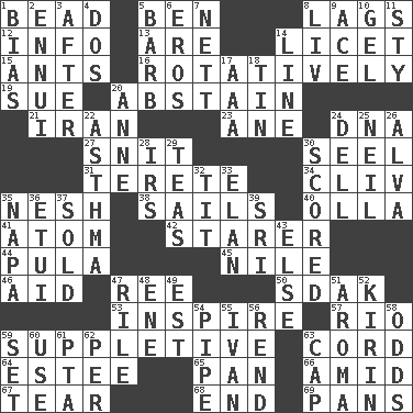 ACROSS 1. Necklace unit 5. Benjamin's nick name 8. Falls behind 12. A message received and understood 13. "We ___ not amused" (Victoria) 14. It is permitted: Lat. 15. Pismires 16. Rotating or pertaining to rotation 19. Institute legal proceedings 20. Choose not to consume 21. SW Asia republic 23. One (Scot) 24. Heredity factor (abbr.) 27. In a ____ (agitated or irritated) 30. Stitch closed the eyes of (a falcon) 31. Cigar-shaped 34. 154 in Roman numerals 35. Delicate 38. Travel by water 40. Water jar 41. Smallest unit of an element 42. A viewer who gazes fixedly 44. Monetary unit of Botswana 45. "Death on the ____" 46. Help 47. To separate or throw off 50. Neighbor of Neb. 53. Motivate 57. _ de Janeiro 59. Supplying deficiencies 63. Drawstring 64. First name in cosmetics 65. Baking dish 66. Among 67. Separate forcefully 68. Conclusion 69. Baking dishes DOWN 1. Prejudice 2. World-weariness 3. Following 4. Two (Sp.) 5. Sharp remark 6. Greek god of love 7. Remaining after all deductions 8. 54 in ancient Rome 9. Adept person 10. Set 11. Filthy place 14. Actor's bit 17. American Automobile Association (abbr.) 18. Metal container 20. Singer Murray 22. Respiratory problem 24. Small valley 25. Famous astronaut Armstrong 26. Inventor's middle name 28. Big collection agency 29. Afternoon social gatherings 30. Tallied 32. Teat (slang) 33. Enthusiasm 35. California wine valley 36. Needle holder 37. Exchanged or delivered for money 39. Indian title of respect (Mr.) 43. Otherwise 47. Cause heat under the collar 48. Compass dir. 49. Eastern Standard Time (abbr.) 51. Odor 52. Japanese brewing company 54. Corncob 55. "Terrible" tsar 56. Tear apart 58. Probability 59. Put into a specified state 60. Purpose 61. Parent Teacher Assoc. 62. For each 63. Head covering