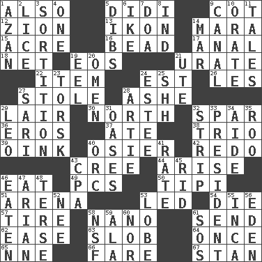 ACROSS 1. In addition 5. "You Light Up My Life" star Conn 9. Small bed 12. The Jewish people; Israel 13. Image 14. Hindu Mythology: god of death 15. Land measure 16. Necklace unit 17. Of or related to the anus 18. Fish or hair follower 19. Greek goddess of the dawn 21. A salt of uric acid 22. A whole individual unit 24. Eastern Standard Time (abbr.) 26. French article 27. Fur scarf 28. American tennis player Robert 29. Den 30. Compass direction 32. Practice fight 36. Greek god of love 37. Had dinner 38. Musical group of three 39. Pig sound 40. Flexible twig of a willow tree 42. Make new 43. Algonquian 44. Originate 46. Ingest 49. Personal Computers (abbr.) 50. Native american tent (variation) 51. Sports stadium 53. Directed 54. Pass on 57. Become fatigued 58. Billionth: prefix 61. Transmit 62. Comfort 63. Messy guy 64. At one time in the past 65. Compass dir. 66. Conductor's collection 67. Comedian Laurel of Laurel & Hardy DOWN 1. Muslim summons to prayer 2. Louse (plural) 3. Drawing lots 4. Single 5. Rights 6. Eisenhower's nickname 7. ___ good deed 8. Indiana (abbr.) 9. Lessep's creation 10. Declaim 11. Stories 14. Spoil 19. Snakelike fish 20. Sign of things to come 21. Shoshoni 23. Cod relative 24. First name in cosmetics 25. Quiet! 27. Indian skirt 28. Nick name for Arthur 29. Lion 31. Fertile tracts in a desert 32. Long narrow piece of something 33. Elected leader of a country 34. Helper 35. Friend of Pooh 40. The grampus (Milton) 41. Assign a rank or rating to 43. Accounting whiz (abbr.) 45. To free from 46. Consumed 47. Believer in; advocate of (suffix) 48. Laconic 52. Born 53. Ear part 55. South American Indian 56. Paradise 58. Science/research agcy. 59. Wing 60. Or not 61. Distress signal