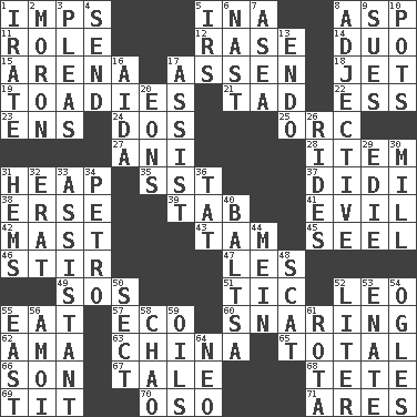 ACROSS 1. Naughty children 5. _ tizzy (2 wds.) 8. Viper 11. Hero or heavy, e.g. 12. Raze (variant) 14. Superhero pair 15. Sports stadium 17. NE Netherlands city 18. _ stream 19. Sycophants 21. Small boy 22. Double-curved letter 23. Followers of ems 24. Two (Sp.) 25. The grampus (Milton) 27. Black tropical American cuckoo 28. Detail 31. Pile 35. Fast jet (abbr.) 37. "You Light Up My Life" star Conn 38. Celtic language 39. Bar bill 41. Morally bad or wrong 42. Vertical spar for supporting sails 43. Scottish cap 45. Sew up the eyelids of hawks and falcons 46. Use a swizzle stick 47. French article 49. Mayday 51. Nervous spasm 52. Lion 55. Erode 57. Environmental prefix 60. Catching in a trap 62. Wet nurse (var.) 63. Large country 65. Add up to 66. Manchild 67. Falsehood 68. Wig 69. Teat (slang) 70. Bear (Spanish) 71. Ancient Greek god of war DOWN 1. Feeling or showing extreme anger 2. Person of subnormal intelligence 3. Entreaties 4. Transmit 5. Big collection agency 6. Political cartoonist Thomas 7. Toward the sea 8. Descriptive word 9. Takes to court 10. Cooking vessels 13. Inside; within (prefix) 16. Opera by Verdi 17. Help 20. Immeasurably long periods of time 26. Amusement-park features 29. Singer Brickell 30. Place where flour is made 31. Is hesitant and indecisive 32. Part of Q.E.F. 33. Aide 34. Stone: prefix 36. Make lace 40. Greek mezzo-soprano Agnes 44. Chow _ 48. Jazz singing style 50. Religious group 52. 61 cubic inches 53. Related on the mother's side 54. Stares 55. Compass direction 56. Mine, in Marseilles 58. US Secretary of Labor Elaine L. _ 59. Lubricates 61. Roll call or roster of names 64. Modern: prefix