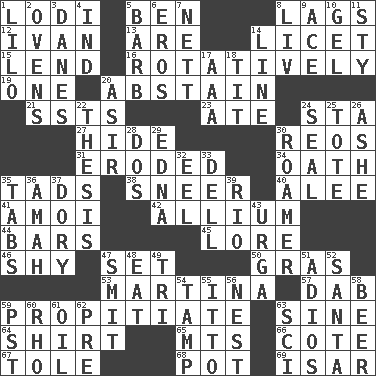 ACROSS 1. Farming town in central California 5. Benjamin's nick name 8. Falls behind 12. "Terrible" tsar 13. "We ___ not amused" (Victoria) 14. It is permitted: Lat. 15. Grant temporary use of 16. Happening in regular succession 19. Single 20. Choose not to consume 21. Fast planes 23. Had dinner 24. R.R. building 27. Flintstone garb 30. Vintage cars 31. Worn away 34. Pledge 35. Small boys 38. Scornful expression 40. Toward shelter 41. Mine, in Marseilles 42. Plant genus of onion and garlic 44. Drinking establishments 45. Old wives' tales, e.g. 46. Like a shrinking violet 47. Arrange properly for use 50. Pate de foie ____ 53. Chrissie's court nemesis 57. Pat or tap gently 59. Conciliate 63. Trig term 64. Chest covering 65. Mountains (abbr.) 66. ____ d'Azur (French Riviera) 67. Lacquered or enameled metalware 68. Plant holder 69. Austrian river, tributary to the Danube DOWN 1. _ and Stitch 2. Baking chambers 3. Natives or inhabitants of Denmark 4. Working for oneself (abbr.) 5. Sharp remark 6. Greek god of love 7. Remaining after all deductions 8. 54 in ancient Rome 9. Adept person 10. Set 11. Filthy place 14. Actor's bit 17. American Automobile Association (abbr.) 18. Teat (slang) 20. SW Saudi Arabia district 22. College paper 24. Lick closed 25. Lug 26. American tennis player Robert 28. Two (Sp.) 29. Pulitzer Prize-winning author Ferber 30. Nomad 32. Snakelike fish 33. Small valley 35. Bar bills 36. Nursemaid 37. Rowboat 39. River (Sp.) 43. Capital and largest city of Mongolia 47. Stricken, poetically 48. Ingest 49. Three (prefix) 51. Goodbye (Sp.) 52. Before Barbara or Clara 54. Pack (down) 55. "Tell ____ the Marines!" 56. Egg locale 58. Fermented drink made from hops 59. Pacific Standard Time (abbr.) 60. 17th letter of the Greek alphabet 61. Petroleum 62. Before (prefix) 63. _-fi