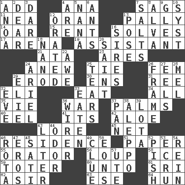 ACROSS 1. Increase 4. Santa ___, CA 7. Sinks 11. Teachers' org. 12. Northwest Algerian city 13. Friendly 14. Boat paddle 15. Monthly bill 16. Finds the solution 17. Sports stadium 19. Aide 21. "One Day ___ Time" 23. Ancient Greek god of war 24. Afresh 25. Standoff 26. Opposite of masc. 29. Eat (away) 30. Followers of ems 31. To separate or throw off 32. Connecticut Ivy Leaguer 33. Erode 34. 100% 35. Compete 36. Armed conflict 37. Insides of hands 40. Snakelike fish 41. ___ a Wonderful Life 42. _ vera 43. Old wives' tales, e.g. 45. Fish or hair follower 46. Home 51. Some stationery 55. Speaker 56. Central Nebraska county 58. Frozen water 59. Carrier 60. To (old English) 61. Indian title of respect (Mr.) 62. SW Saudi Arabia district 63. Compass dir. 64. Attila the _ DOWN 1. Small Philippine buffalo 2. Letter starter 3. Have the gumption 4. "We ___ not amused" (Victoria) 5. Grandmother 6. Pismires 7. Table seasonings 8. Inventor's middle name 9. Small, secluded valley 10. System (abbr.) 12. Declaimed 13. Airs 16. Founders of families 18. Billionth: prefix 20. Inhabitant of Heaven 22. Deep reverence 24. Satellite of Uranus 25. Lacerates 26. Movie unit 27. Snakelike fish 28. Cartoonist voice _ Blanc 29. Writer Wiesel 32. Night before a holiday 33. Consumed 36. One who wires 37. Baking dish 38. City in Syria 39. Globular water bottle used in Asia 43. 61 cubic inches 44. Scent 46. Roll call or roster of names 47. Greek god of love 48. Suttee (variant) 49. A slight indication 50. Immeasurably long periods of time 52. Expression of disdain 53. Shade of tan 54. It's straight from the horse's mouth 57. Shoshoni