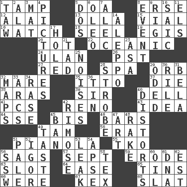 ACROSS 1. Pack (down) 5. ___ good deed 8. Celtic language 12. Jai ____ 13. Spanish pot 15. Small bottle 16. Observe 18. Sew up the eyelids of hawks and falcons 19. The front part of a cuirass 20. Small child 22. Pertaining to the sea 24. Uhlan (variant) 26. Pacific Standard Time (abbr.) 27. Do over again 28. Health resort 29. Globe 32. Female horse 35. "Tell ____ the Marines!" 37. Expire 38. Ancient river in northeast Turkey 39. Title for a knight 40. Small valley 41. Personal Computers (abbr.) 42. Former U.S. Attorney General Janet 43. The main thing one is thinking about 44. Compass dir. 45. Altar cloth linen 46. Oblong pieces of solid material 49. Scottish cap 50. Part of Q.E.F. 51. Player piano 55. Ring climax 56. Droops 57. Back-to-school mo. 59. Eat (away) 63. Narrow, elongated depression 64. Comfort 65. Airtight sealed metal containers 66. We are 67. A weed 68. Narrow board DOWN 1. The 23rd letter of the Hebrew alphabet 2. Insect wing 3. Floor covering 4. Photos 5. Two (Sp.) 6. Margarine 7. Actor Baldwin 8. Happening 9. Swiss mountan, "Queen of the Mountains" 10. Ketch in the Levant 11. Raised railways 14. City in Syria 17. Hollow 21. Small boy 23. White ___ sheet 25. Annoying sounds 28. Disco prop 29. Wrote a lyric poem 30. Cause heat under the collar 31. Actor Lugosi 32. Atlas contents 33. Curves 34. To erase 36. Metal container 40. What propaganda does 42. Full of chinks, cracks, or crevices 45. Prohibit 47. Tate display 48. Libertine 49. Clothes sense 51. Light colored 52. Composer Stravinsky 53. Path through which fluid escapes 54. Domed church section 56. Compass dir. 58. John Ritter's dad 60. Lubricate 61. Heredity factor (abbr.) 62. Eastern Standard Time (abbr.)