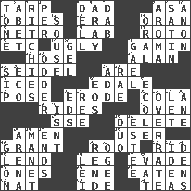 ACROSS 1. Canvas cover 5. June honoree 8. White ___ sheet 11. Off-Broadway awards 13. Period 14. Northwest Algerian city 15. Paris' subway 16. Experiment locale 17. Printing process, for short 18. And so on (abbr.) 19. Unsightly 21. Street urchin 22. Flexible conduit 24. ____ Jay Lerner 25. A glass for beer 27. "We ___ not amused" (Victoria) 29. On the rocks 30. Peak District village in England 32. Introduce or present, as a question 33. Eat (away) 35. Root beer relative 39. Amusement-park features 41. Baking chamber 42. Compass dir. 43. Keyboard key 45. So be it 48. One who uses or employs something 49. Let have 50. Carrot, for example 52. To free from 55. Grant temporary use of 56. Part of a journey 57. Dodge 59. Singles 60. Compass dir. 61. Consumed 62. Floor protector 63. Binary compound 64. Afternoon social gatherings DOWN 1. Heavy book 2. Collude with 3. Actors Guy, Robert Welles, and Clint 4. For each 5. Small valley 6. Like ___ of sunshine 7. Apply (a substance) by light strokes 8. Odor 9. Smooth fabric 10. Soon (poet.) 12. Boozer 14. Spoken 20. Set 21. Highlander 23. More peculiar 25. Small drink 26. Environmental prefix 27. Say or write further 28. Actress Charlotte 30. Greek goddess of the dawn 31. Learning spot: Fr. 33. Begley and Asner 34. Portuguese money of account (variant) 36. Make much ado about nothing 37. Allow 38. One (Scot) 40. Is not 43. Superhero pair 44. First name in cosmetics 45. Sports stadium 46. French painter Edouard 47. Extremities 49. Seize upon or latch onto something 50. Tear apart 51. Double curve, resembling the letter S 53. It may be bright or harebrained 54. Habitations of wild animals 56. Flowery wreath 58. Large container