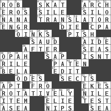 ACROSS 1. Director Reiner 4. Three-handed card game 8. Bowlike part 12. Greek god of love 14. Filth; sediment 15. Grain storage tower 16. Nanny 17. Interpreter 20. Engineer (abbr.) 21. Expire 22. Accounting whiz (abbr.) 23. Pig sounds 27. Expression of disdain 29. Saudi Arabian king (1953-1964) 31. Helper 34. Following 35. Oceans 36. Brightly colored fish 39. Plant excrement 41. Is not 42. Cause heat under the collar 43. Eucharist need 46. Actor Lugosi 47. Prepare for publication 48. Lyric poems 51. Religious groups 54. Fitting 56. Back 58. Supplements with great effort 61. Happening in regular succession 66. "Death on the ____" 67. Detail 68. Writer Wiesel 69. Trial 70. At sea 71. Pinches, bites 72. Ocean DOWN 1. French philosopher Descartes 2. NW Algerian seaport 3. Beat drum 4. Fast jet (abbr.) 5. Apertif with cassis 6. Insect wing 7. Look after 8. White ___ sheet 9. Actors Guy, Robert Welles, and Clint 10. Hoof sound 11. Israeli folk dance 13. Indian skirt 18. Small drink 19. Flowery wreath 24. Overdraft (abbr.) 25. Krazy ___ of comics 26. Institutes legal proceedings 28. Indian antelope 30. Window treatment 32. Daniel's nick name 33. Eastern Standard Time (abbr.) 34. Toward the future 36. Globe 37. Sliced dessert 38. One to whom something is allotted 40. Writing tablets 44. Make a knot 45. And so on (abbr.) 49. Lizard (obsolete) 50. _ Lanka 52. Portable shelter 53. Atmospheres 54. Roberta Peters solo 55. Plant holders 57. Baking chamber 59. Otherwise 60. Bristle 62. Nanny (var.) 63. Connecticut Ivy Leaguer 64. Mouth edge 65. It is so