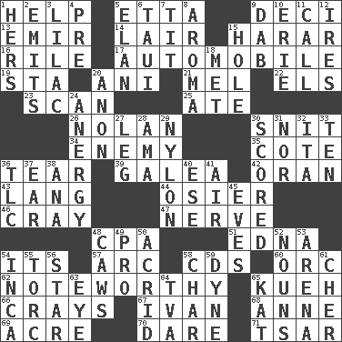 ACROSS 1. Aid 5. Singer James 9. Tenth: prefix 13. Arab leader 14. Den 15. Ethiopian city, capital of Harari 16. Cause heat under the collar 17. Form of transportation 19. R.R. building 20. Black tropical American cuckoo 21. Cartoonist voice _ Blanc 22. Raised railways 23. Glance over 25. Had dinner 26. Pitcher Ryan 30. In a ____ (agitated or irritated) 34. Foe 35. ____ d'Azur (French Riviera) 36. Pull apart 39. An organ shaped like a helmet 42. NW Algerian seaport 43. Long (Scottish) 44. Flexible twig of a willow tree 46. Supercomputer manufacturer 47. Effrontery 48. Accounting whiz (abbr.) 51. Pulitzer Prize-winning author Ferber 54. It is 57. Curve 58. Music discs 60. The grampus (Milton) 62. Music shop? 65. Malaysian steamed pastry 66. Trading vessels 67. _ the terrible 68. Queen of England 1702-14 69. Measure of real estate 70. Have the gumption 71. Russian ruler of old DOWN 1. Possessive pronoun 2. Gives off 3. Pale purple color 4. Before (prefix) 5. Style 6. "Change" in Tahitian 7. Teat (slang) 8. Odor 9. Small moist lump or mass 10. 4th largest of the Great Lakes 11. Give a ring to 12. Angers 15. Opening into or through something 18. Was introduced to 20. Soon (poet.) 24. Disorder of the immune system 27. Part of a journey 28. Nursemaid (var.) 29. Thermoplastic polyamide 30. Tallied 31. Or not 32. Call ___ day 33. Nine, plus one 36. Affectionate concern, for short 37. Hearing organ 38. Santa ___, CA 40. Compass dir. 41. Atmosphere 45. Nights before holidays 48. Crow sounds 49. Adept person 50. Bitter 52. Parts of speech 53. Sports stadium 54. South American Indian 55. Torque (variant) 56. Play the lead 58. Burn to charcoal 59. Unit of force 61. "Mermaids" star 63. Sight organ 64. Federal power corp. 65. Krazy ___ of comics