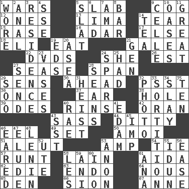 ACROSS 1. Armed conflicts 5. Thick slice 9. Gear tooth 12. Singles 13. Pale green bean 14. Separate forcefully 15. Raze (variant) 16. The sixth month of the Jewish calendar 17. Otherwise 18. Biblical high priest 19. Consume 21. An organ shaped like a helmet 22. Movie discs 24. A female animal or person 26. Eastern Standard Time (abbr.) 27. Gospel singer Marvin 28. Connect, as a bridge 29. Elected reps. 30. Having the leading position 32. Inconspicuous attention getter 36. At one time in the past 37. Ewer handle 38. Hollow 39. Lyric poems 40. Remove soap 42. NW Algerian seaport 43. Backtalk 44. Short, simple song 46. Snakelike fish 49. Arrange properly for use 50. Mine, in Marseilles 51. Eskimo relative 53. Electrical Unit 54. Neckwear 57. The smallest animal of a litter 58. (Had) reclined 61. Opera by Verdi 62. Singer Brickell 63. Inside; within (prefix) 64. Good sense 65. Lair 66. The Jewish people; Israel 67. Queen of England 1702-14 DOWN 1. Had on 2. Of or related to the anus 3. Dwelling 4. Compass dir. 5. Narrow board 6. Flaplike covering 7. Housemaid (var.) 8. Drinking establishment 9. Cell (Danish) 10. Fertile tracts in a desert 11. Relatively large 14. Beverage made from leaves 19. Begley and Asner 20. Toward the sea 21. Commissioned military rank (abbr.) 23. Flower holders 24. Practice fights 25. Possessed 27. Post 28. Actors Connery and Penn 29. "Barney Miller" actor Jack 31. Robbery 32. Picture 33. Conclusion 34. Kill 35. "___ Little Indians" 40. Actress Charlotte 41. Dutch treat 43. Fast jet (abbr.) 45. Naughty child 46. Having ears or earlike features 47. Evade 48. Soviet premier 1918-24 52. Shoshoni 53. At once, immediately (arch.) 55. Goddess of spring and wife of Bragi 56. Relaxation 58. French article 59. Cuckoo 60. Wedding promise 61. Santa ___, CA