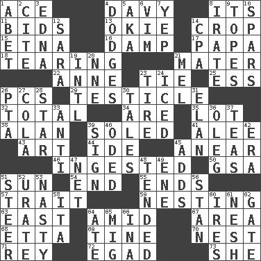 ACROSS 1. Adept person 4. _ Jones' Locker 8. It is 11. Auction offers 13. Migrant worker of the '30s 14. Riding implement 15. Inactive volcano in Sicily 16. Moist 17. Dad 18. Lacerating 21. Mother 22. Singer Murray 23. Make a knot 25. Double-curved letter 26. Personal Computers (abbr.) 29. One of the two male reproductive glands 32. Add up to 34. "We ___ not amused" (Victoria) 35. Car dealer's back yard 38. Actor Alda or Thicke 39. Having a sole or soles 41. Toward shelter 43. Nonscientific branch of learning 44. Binary compound 45. Approach 46. Consumed 50. Girls' org. (abbr.) 51. Player for Phoenix 54. Conclude 55. Conclusions 57. Distinguishing feature 59. Snuggling 63. 90 degrees 64. Among 67. Type of rug 68. Singer James 69. Prong on a fork 70. A home for chicks 71. Marina Del _, California 72. Mild oath 73. A female animal or person DOWN 1. Collude with 2. Quote 3. Pulitzer Prize-winning author Ferber 4. Evades 5. Alias (abbr.) 6. Zeal 7. Slangy assent 8. Feeling or showing extreme anger 9. Drinks excessively 10. Practice fights 12. "Two Mules for Sister ____" 14. Accounting whiz (abbr.) 19. International (abbr.) 20. Compass dir. 21. Cartoonist voice _ Blanc 23. Hoop that covers a wheel 24. On the rocks 26. Parent Teacher Association (abbr.) 27. Root beer relative 28. Play the lead 30. Lies 31. Enthusiasm 33. Opposed to 36. Cassini of fashion 37. Afternoon social gatherings 39. Omen 40. Wrote a lyric poem 42. Period 45. Sums up 47. Fish or hair follower 48. Watched over 49. Compass dir. 51. Navigate 52. A salt of uric acid 53. Offensive 56. Comedian Laurel of Laurel & Hardy 58. Call ___ day 60. Angers 61. Soft 62. Yard entry 64. Had dinner 65. Russian fighter aircraft 66. _ tizzy (2 wds.)
