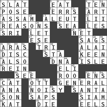 ACROSS 1. Narrow board 5. Ingest 8. "___ Little Indians" 11. Introduce or present, as a question 12. Blunders 14. Tate display 15. Indian state 17. Eskimo relative 18. Cards in a Roman deck? 19. Thinks logically 21. Ocean 22. French article 23. _ Lanka 24. Allow 25. Fish or hair follower 27. Compass dir. 28. Sinks 31. Caspian sea tributary 35. Three (prefix) 37. Mountain range southwest of Kyrgyzstan 38. Plate 39. R.R. building 41. Peachy ____! 42. In addition 43. Heredity factor (abbr.) 45. Small island 46. It's straight from the horse's mouth 47. Connecticut Ivy Leaguer 49. Observe 51. Friend of Pooh 52. Followers of ems 55. Domesticated feline 57. Baseball player Mel 60. Commissioned military rank 62. Santa ___, CA 63. Annoyingly loud 65. Before Barbara or Clara 66. Manchild 67. Plant excrements 68. Thailand, formerly 69. Krazy ___ of comics 70. Pass on 71. Snakelike fish DOWN 1. Practice fights 2. Failure 3. Slender Brazilian palm 4. Afternoon social gatherings 5. Snakelike fish 6. Ancient Greek god of war 7. Loyal 8. Baron Munchausen's specialties 9. 4th largest of the Great Lakes 10. Nuclear Threat Initiatives 13. Comedian Laurel of Laurel & Hardy 16. Undercover agent 17. Michaelmas daisies 20. A home for chicks 26. 1973 Nobel Price Winner (Physics) Leo 29. Highlander 30. Trig term 31. The sixth month of the Jewish calendar 32. Cause heat under the collar 33. Aide 34. Biscuitlike quick bread 36. It would 40. Disorder of the immune system 44. Medicinal plant 48. Charged atoms 50. Immeasurably long periods of time 52. Bert's buddy 53. Relating to or accompanying birth 54. Hits or strikes with great force 55. Keg 56. Small Philippine buffalo 58. Frog relative 59. Native american tent (variation) 61. Comfort 64. Compass dir.