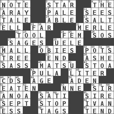 ACROSS 1. Short letter 5. Play the lead 9. Definite Article 12. Like ___ of sunshine 13. Diluted with white 14. Perceives with the eye 15. Falsehood 16. Competent 17. Table seasoning 18. Pipe bend 19. At a great distance 21. Haggard of country music 22. Implement 24. Opposite of masc. 26. Distress signal 27. Gurus 28. Ubangi River tributary 29. Shopping center 30. Off-Broadway awards 32. Plant holders 36. Woody plant 37. Conclusion 38. American tennis player Robert 39. Backtalk 40. Taiwanese island in East China Sea 42. Portico 43. Monetary unit of Botswana 44. 61 cubic inches 46. Music discs 49. Personal question 50. Arabian gulf 51. Ingested 53. Compass dir. 54. Title for a knight 57. Small Philippine buffalo 58. Suttee (variant) 61. Male parent of an animal 62. Back-to-school mo. 63. Halt 64. _ the terrible 65. Curvy letter 66. Labels 67. Look after DOWN 1. Nathan's nickname 2. Relating to the mouth 3. Baron Munchausen's specialties 4. Sight organ 5. Coast Guard woman 6. Bar bill 7. 100% 8. Portuguese money of account (variant) 9. Pulls apart 10. Phone greeting 11. _____ Park, CO 14. Compass dir. 19. Enemy 20. In addition 21. Madame (abbr.) 23. Stares at amorously 24. Eats 25. Raised railways 27. "Two Mules for Sister ____" 28. National forest in Provo, Utah 29. Mountains (abbr.) 31. Calif. Air Force Base 32. Thick mixture 33. Clearly or manifestly demonstrative 34. Son of Odin 35. Ocean 40. Java container 41. ____ Bator 43. Baking dish 45. Binary compound 46. Desist 47. Natives or inhabitants of Denmark 48. Constricts 52. Erode 53. Cuts off 55. SW Asia republic 56. Tear apart 58. Fast jet (abbr.) 59. _ moment's notice (2 wds.) 60. Coat; cloak 61. Be seated