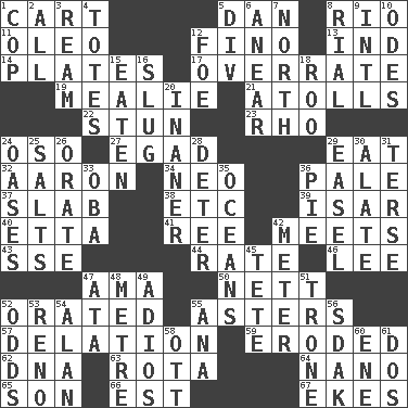 ACROSS 1. Draw slowly or heavily 5. One of the 12 tribes of Israel 8. _ de Janeiro 11. Margarine 12. Fine (Spanish) 13. Indiana (abbr.) 14. Food holders 17. Make much ado about nothing 19. Ear of corn 21. Ringlike coral islands and reefs 22. Make senseless or dizzy 23. 17th letter of the Greek alphabet 24. Bear (Spanish) 27. Mild oath 29. Consume 32. Composer Copland 34. Modern: prefix 36. Light colored 37. Broad, flat, thick piece 38. And so on (abbr.) 39. Austrian river, tributary to the Danube 40. Singer James 41. To riddle 42. Confronts 43. Compass dir. 44. Pace 46. Area sheltered from the wind 47. Wet nurse (var.) 50. Remaining after all deductions 52. Spoke pompously 55. Michaelmas daisies 57. Conveyance 59. Eaten away 62. Heredity factor (abbr.) 63. Round or rotation of duties 64. Billionth: prefix 65. Manchild 66. Eastern Standard Time (abbr.) 67. Makes supply last DOWN 1. Police officer (slang) 2. 100% 3. 480, 500 or 516 sheets of paper 4. Hauls 5. HTML Container Element 6. Approach 7. _ pole 8. Monetary unit of Yemen 9. International (abbr.) 10. Lyric poems 12. Enemy 15. Consumed 16. A hard, heavy blow 18. Friend of Pooh 20. Sillier 24. Fertile tracts in a desert 25. Table seasonings 26. Declaim 28. Prevent from occurring 29. Artist's stand 30. Having winglike extensions 31. Laconic 33. Chief or king in Benin or Nigeria 35. Seas 36. Sliced dessert 42. Distance measurement 45. Wig 47. _ moment's notice (2 wds.) 48. Distance measurement (Brit.) 49. Goodbye (Sp.) 51. Heavy duty weighing machine 52. Likelihood 53. Western Nevada city 54. Actor Alda or Thicke 55. Santa ___, CA 56. Neighbor of Neb. 58. Baseball player Mel 60. Compass dir. 61. Two (Sp.)