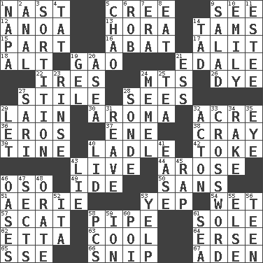 ACROSS 1. Political cartoonist Thomas 5. Algonquian 9. Observe 12. Small Philippine buffalo 13. Israeli folk dance 14. Scottish caps 15. Component 16. Blind as ____ 17. Set down 18. The first octave above the treble staff 19. E Mali city 21. Peak District village in England 22. Angers 24. Mountains (abbr.) 26. Color 27. Vertical member of a panel or frame 28. Observes 29. (Had) reclined 30. Scent 32. Land measure 36. Greek god of love 37. Compass dir. 38. Supercomputer manufacturer 39. Prong on a fork 40. Dipping utensil 42. Puff or smoke 43. Moving, as bait 44. Came up 46. Bear (Spanish) 49. Binary compound 50. Without 51. Nest on high 53. Slangy assent 54. Dripping 57. Get outta here! 58. Corncob 61. Not divided or shared with others 62. Singer James 63. Calm and collected 64. Celtic language 65. Compass dir. 66. Sever or remove by pinching or nipping 67. Arabian gulf DOWN 1. California wine valley 2. Of or related to the anus 3. Making a chance decision by using lots 4. Make lace 5. US Secretary of Labor Elaine L. _ 6. Director Reiner 7. Epoch 8. Ingest 9. First course 10. Poet Dickinson 11. First name in cosmetics 14. Bit 19. Set 20. Toward the sea 21. Double-curved letter 23. Remove soap 24. Klaipeda city 25. Beverage made from leaves 27. Indian skirt 28. Message 29. Allow 31. Break or tear apart 32. Gambison 33. What you're doing now 34. Immoral or dissolute person 35. Sight organ 40. Hat (slang) 41. Relaxation 43. Untruth 45. Reproach for some lapse or misdeed 46. Fertile tracts in a desert 47. Religious groups 48. Declaim 52. Call ___ day 53. Sharp bark 55. Otherwise 56. Adolescent 58. Personal Computers (abbr.) 59. Electrically charged atom 60. Luau course 61. Ocean