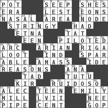 ACROSS 1. Plant holder 4. Ooze 8. "______ My Girl" (Turtles hit) 12. Period 13. For fear that 14. Immeasurably long periods of time 15. Relating to the nose 18. Type of rug 19. Thickened enlargement 20. Slender, wiry 22. Possessed 23. Inactive volcano in Sicily 24. Make lace 25. Car or cant ending 26. Manned the helm 30. Curve 33. Believer in; advocate of (suffix) 36. Port city in Latvia 37. Spoils 39. Indiana (abbr.) 40. Coast Guard woman 41. Competent 42. Collect or gather 44. Binary compound 45. Thinks logically 47. Santa ___, CA 50. Bit 51. Ballerina skirt 53. Apertif with cassis 54. Boisterous (Brazilian Portuguese) 57. Actor Baldwin 59. Adolescent 61. Poet Dickinson 63. Place where flour is made 64. 57 in ancient Rome 65. Born 66. Corncob 67. Penny 68. Republican Party DOWN 1. Fenced enclosure 2. Mouths or openings 3. Clothes sense 4. Volcanic refuse 5. Suggestive of the supernatural 6. Compass dir. 7. Parent Teacher Assoc. 8. Legislators 9. Parka part 10. Conclusion 11. Compass dir. 16. Johnson of "Laugh-In" 17. Actor's bit 21. Nanny 22. Actor Linden 24. Shallow baking pan 26. Groovy apts. 27. Native american tent (variation) 28. Mild oath 29. Have the gumption 30. Having or resembling wings 31. Loose flowing garment 32. Root beer relative 34. Basketball hoops 35. _ tizzy (2 wds.) 38. One of the two male reproductive glands 42. Added to 43. Suttee (variant) 46. Rowing implement 48. Naked 49. Smallest unit of an element 52. Exploiting 53. Seaweed 54. It's straight from the horse's mouth 55. A single undivided whole 56. Butter sub 57. Electrical Unit 58. Cards in a Roman deck? 59. Affectionate concern, for short 60. Night before a holiday 62. Slangy assent