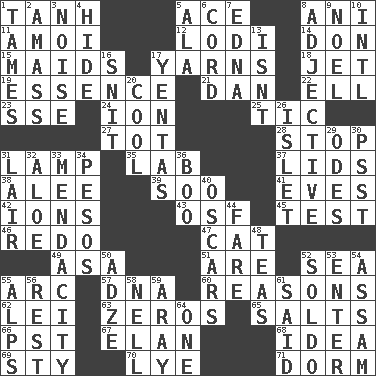 ACROSS 1. Hyperbolic tangent 5. Adept person 8. Cuckoo 11. Mine, in Marseilles 12. Farming town in central California 14. Spanish title 15. Women servants 17. Entertaining tales 18. Passenger plane 19. Center 21. One of the 12 tribes of Israel 22. Pipe bend 23. Compass dir. 24. Electrically charged atom 25. Nervous spasm 27. Small child 28. Cease 31. Desk light 35. Experiment locale 37. Hats (slang) 38. Toward shelter 39. "Barney Miller" actor Jack 41. Nights before holidays 42. Charged atoms 43. Order of Saint Francis (abbr.) 45. Trial 46. Redecorate 47. Feline 49. White ___ sheet 51. "We ___ not amused" (Victoria) 52. Ocean 55. Curve 57. Heredity factor (abbr.) 60. Thinks logically 62. Luau accessory 63. Nothings 65. Table seasonings 66. Pacific Standard Time (abbr.) 67. Enthusiasm 68. The content of cognition 69. Filthy place 70. Sodium hydroxide 71. Dormintory (informal) DOWN 1. Makes less strong or intense 2. Collect or gather 3. Annoying sound 4. Flintstone garb 5. According to 6. Drawstring 7. Pulitzer Prize-winning author Ferber 8. Descriptive word 9. Christmas carol 10. International (abbr.) 13. Is not 16. In a ____ (agitated or irritated) 17. Gossips 20. Calm and collected 26. Small island 29. Lyric poems 30. Inconspicuous attention getter 31. Den 32. _ vera 33. Ananias' fault 34. Mexican monetary units 36. Oct. 31 cry 40. Motion picture awards 44. Conductor's collection 48. Beverages made from leaves 50. Edge tool used to cut and shape wood 52. Twentieth part of a lira 53. Keyboard key 54. Indian state 55. High mountains 56. Respite 58. 1994 drama film starring Jodie Foster 59. Like ___ of sunshine 61. Stated 64. Single