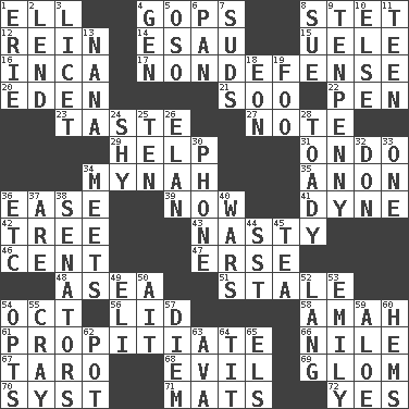 ACROSS 1. Pipe bend 4. Republicans 8. Proofreading order 12. It's straight from the horse's mouth 14. He sold his birthright 15. Ubangi River tributary 16. South American Indian 17. Unrelated to defense, as in spending 20. Genesis locale 21. "Barney Miller" actor Jack 22. Animal enclosure 23. Clothes sense 27. Brief written record 29. Assist 31. Southwest Nigerian state 34. Non-adult bird? 35. At once, immediately (arch.) 36. Comfort 39. Immediately 41. Centimeter-gram-second unit of force 42. Family _ (genealogy) 43. Characterized by obscenity 46. Penny 47. Celtic language 48. At sea 51. Lacking originality or spontaneity 54. Sep. follower 56. Flaplike covering 58. Nursemaid 61. Appease 66. "Death on the ____" 67. Edible starchy tuberous root 68. Morally bad or wrong 69. Take by theft 70. System (abbr.) 71. Floor coverings 72. Consenting reply DOWN 1. One of the Great Lakes 2. Grant temporary use of 3. It is permitted: Lat. 4. Commissioned mil. rank 5. Bear (Spanish) 6. Baking dish 7. Beer foam 8. Institute legal proceedings 9. 3-inch nail 10. Otherwise 11. Adolescent 13. Grandmother 18. Period of immesurable duration 19. Egg _ yung 24. Like a shrinking violet 25. "___ Little Indians" 26. Enthusiasm 28. Sycophant 30. Give a jingle 32. Spanish title 33. Single 34. Confronts 36. And so on (abbr.) 37. "We ___ not amused" (Victoria) 38. Legislators 40. Armed conflicts 44. Fast jet (abbr.) 45. Beverage made from leaves 49. Connecticut Ivy Leaguer 50. Small island 52. Long (Scottish) 53. Poet Dickinson 54. Chooses 55. Supercomputer manufacturer 57. South Vietnam president (1954) 59. _ vera 60. Folds over and sews together 62. Plant holder 63. Actress Gardner 64. Teat (slang) 65. Raised railways