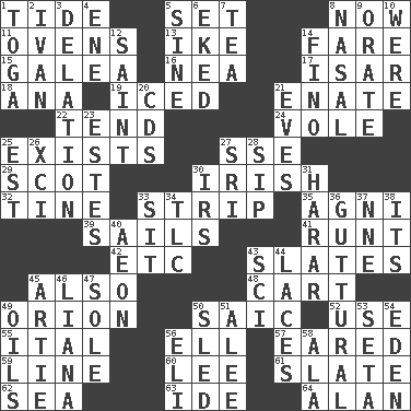 ACROSS 1. Periodic rise and fall of the sea level 5. Put into a specified state 8. Immediately 11. Baking chambers 13. D.D.E's nickname 14. Conductor's collection 15. An organ shaped like a helmet 16. Teachers' org. 17. Austrian river, tributary to the Danube 18. Santa ___, CA 19. On the rocks 21. Maternal 22. Watch over 24. Grand slam 25. Has an existence 27. Compass dir. 29. Highlander 30. From or relating to Ireland 32. Prong on a fork 33. Remove all contents or possession from 35. Hindu god of fire 39. Moves on water 41. The smallest animal of a litter 42. And so on (abbr.) 43. Chalkboards 45. In addition 48. Draw slowly or heavily 49. Greek mythologigal hunter 50. Ketch in the Levant 52. Purpose 55. Slanted text style (abbr.) 56. Pipe bend 57. Having ears or earlike features 59. Actor's bit 60. Area sheltered from the wind 61. Chalkboard 62. Ocean 63. Binary compound 64. Actor Alda or Thicke DOWN 1. Ancient Roman robe 2. "Terrible" tsar 3. Accusation by an informer 4. Compass dir. 5. Trig term 6. Supplemented with great effort 7. Afternoon social gathering 8. Relating to the nose 9. Speak pompously 10. Past tense of be (plural) 12. Virtuous person 14. A pale, very dry sherry 20. Music discs 21. Nights before holidays 23. _____ Park, CO 25. Eastern Standard Time (abbr.) 26. One more than ninety 27. Indian title of respect (Mr.) 28. Small drink 30. Big collection agency 31. Ethiopian city, capital of Harari 33. Be seated 34. Affectionate concern, for short 36. From the throat 37. Compass dir. 38. It is 40. Period of immesurable duration 43. _-fi 44. Shoestrings 45. Nick name for Arthur 46. Climbing, woody, usually tropical vines 47. Not divided or shared with others 49. Petroleums 50. Downhill vehicle 51. Toward shelter 53. Bristle 54. Locale of original sin 56. Biblical high priest 58. Wing