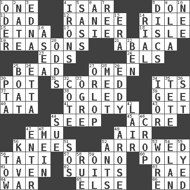 ACROSS 1. Single 4. Austrian river, tributary to the Danube 8. Spanish title 11. Male parent 12. Indian princess (variant) 14. Cause heat under the collar 15. Inactive volcano in Sicily 17. Flexible twig of a willow tree 18. Small island 19. Thinks logically 21. Phillipine bananalike plant 23. Begley and Asner 24. Raised railways 25. Necklace unit 27. Presage 30. Plant holder 31. Tallied 34. It is 37. Make lace 38. Stared at amorously 39. Unit of force equal to gravity 40. "One Day ___ Time" 41. TNT 43. Baseball player Mel 44. Ooze 45. Land measure 47. Australian flightless bird 49. Atmosphere 50. Leg joints 52. Moved like an arrow 56. Jacques of French films 57. U. of Maine site 60. More than one (prefix) 61. Baking chamber 62. Costumes for special activities 63. Actress Charlotte 64. Armed conflict 65. Otherwise 66. Conclusion DOWN 1. River in Europe 2. Nathan's nickname 3. Pulitzer Prize-winning author Ferber 4. Removes the wrinkles 5. Backtalk 6. Cuckoo 7. To sift 8. Flat circles 9. Spanish pot 10. Born 13. Period 14. Monetary unit of Yemen 16. At sea 20. Likelihood 22. Benjamin's nick name 25. Water vessel 26. Singer James 27. Lowest deck of a ship 28. Confront 29. Whirlpool 30. Parent Teacher Assoc. 32. ____ d'Azur (French Riviera) 33. Legendary monster 34. Composer Stravinsky 35. Wig 36. Arrange properly for use 42. Den 44. Institute legal proceedings 46. Riding implement 47. Keyboard key 48. Count _ (2 wds.) 49. Came up 50. Polynesian shrub of the pepper family 51. Mayday 52. Pismires 53. Had on 54. Liveliness 55. Colored 56. Pull behind 58. Sorrow 59. Lubricate