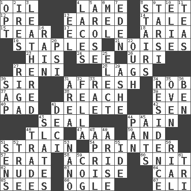 ACROSS 1. Lubricate 4. Unable to walk 8. Proofreading order 12. Before (prefix) 13. Having ears or earlike features 14. Story 15. Pull into pieces 17. Learning spot: Fr. 18. Operatic vocal solo 19. Paper fasteners 21. Annoying sounds 23. Part of HMS, perhaps 24. Observe 26. RI univ. 27. Painter Guido (1575-1642) 28. Falls behind 30. Title for a knight 31. Anew 34. Director Reiner 37. Mature 38. Arrive at 39. Night before a holiday 40. Groovy apt. 41. Erase 42. Elected rep. 43. Lick closed 44. Ache 46. Affectionate concern, for short 47. American Automobile Association (abbr.) 50. Plus 51. Put through a sieve 54. Hard copy producer 57. Part of Q.E.F. 58. Bitter 60. In a ____ (agitated or irritated) 62. Unadorned 63. Annoying sound 64. 4-wheeled motor vehicle 65. Observes 66. Stare at amorously 67. Biblical high priest DOWN 1. Elect 2. Angers 3. Resembling or made to resemble leather 4. Shoestrings 5. Came up 6. Cartoonist voice _ Blanc 7. Paradise 8. Flight of steps 9. Tarsus (plural) 10. Writer Wiesel 11. Beverages made from leaves 13. Snakelike fish 16. Precipitation 20. Air pressure measure (abbr.) 22. Ending for "Through" and "Enough" 25. Opt 27. Port city in Latvia 29. American tennis player Robert 30. Plant excrement 31. Type of rug 32. Chap (slang) 33. Actress Charlotte 34. Dwelling 35. Baking chamber 36. Benjamin's nick name 41. Tenth: prefix 43. Chalkboards 44. Baking dish 45. Pismires 46. Swap 48. Showery time 49. Ascend 51. Elected reps. 52. Loyal 53. Billionth: prefix 55. Binary compound 56. Monetary unit of Yemen 59. Gear tooth 61. Three (prefix)