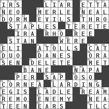 ACROSS 1. Big collection agency 4. One who doesn't tell the truth 8. Singer James 12. Modern: prefix 13. Haggard of country music 14. Actress Patricia 15. Dormintory (informal) 17. Vices 18. Through, poetically 19. Paper fasteners 21. Cylindrical with tapered ends 23. Lyricist Gershwin 24. 17th letter of the Greek alphabet 26. Portuguese money of account (variant) 27. Comedian Laurel of Laurel & Hardy 28. Past tense of be (plural) 30. Biblical high priest 31. Ringlike coral islands and reefs 34. Domesticated feline 37. Superhero pair 38. Natives or inhabitants of Denmark 39. Mouth or opening 40. Elected rep. 41. Erase 42. Was introduced to 43. Object of repulsion 44. California wine valley 46. For each 47. Plant excrement 50. Bear (Spanish) 51. Pupil covering 54. Preparing or cooking with lard 57. The front part of a cuirass 58. Dipping utensil 60. 480, 500 or 516 sheets of paper 62. San ____ (Riviera town) 63. Foe 64. Teachers' org. 65. Adolescent 66. Hearing organs 67. Affectionate concern, for short DOWN 1. Indiana (abbr.) 2. Vintage cars 3. Conclusion 4. Prying instrument 5. From or relating to Ireland 6. Everything 7. Take ten 8. Main course 9. Giggle 10. Small pie 11. Medicinal plant 13. Cartoonist voice _ Blanc 16. Hindu Mythology: god of death 20. Baking dish 22. Blunders 25. A small or young owl 27. Turn sharply 29. Otherwise 30. Begley and Asner 31. An important port of Yemen 32. Stories 33. Single 34. Part 35. Length times width 36. Make lace 41. Have the gumption 43. Gillaume's butler role 44. Dreamland 45. SW Saudi Arabia district 46. A-one 48. Tree or shrub in the Birch family 49. Insides of hands 51. Certainty 52. Double curve, resembling the letter S 53. Toward shelter 55. Marina Del _, California 56. Highlander 59. Santa ___, CA 61. Apple computer (short form)