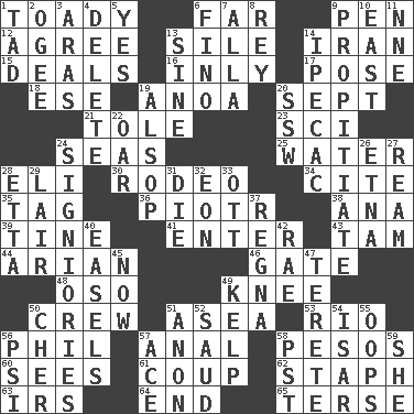 ACROSS 1. Sycophant 6. Distant 9. Fenced enclosure 12. Match 13. Drop; flow; fall 14. SW Asia republic 15. Allots cards 16. Inwardly 17. Introduce or present, as a question 18. Compass dir. 19. Small Philippine buffalo 20. Back-to-school mo. 21. Lacquered or enameled metalware 23. _-fi 24. Oceans 25. Wetness 28. Biblical high priest 30. Cowboy competition 34. Quote 35. Label 36. Peter (Polish) 38. Santa ___, CA 39. Prong on a fork 41. Keyboard key 43. Scottish cap 44. Believer in; advocate of (suffix) 46. Yard entry 48. Bear (Spanish) 49. Leg joint 50. Group working together 51. Toward the sea 53. River (Sp.) 56. Silvers or Donahue 57. Of or related to the anus 58. Mexican monetary units 60. Perceives with the eye 61. Clever action or accomplishment 62. Staphylococcus 63. Big collection agency 64. Conclusion 65. Laconic DOWN 1. Small amount or degree 2. Double curve, resembling the letter S 3. Caspian sea tributary 4. Keyboard key 5. It is so 6. A pale, very dry sherry 7. Silent film actress Nazimova 8. Marina Del _, California 9. Appease 10. 90 degrees 11. Compass dir. 13. Trig term 14. Medicinal drug used to evoke vomiting 19. Columnist Joseph or Stewart 20. Compass dir. 22. Rowing implement 24. Seigniories (variant) 26. Inactive volcano in Sicily 27. 480, 500 or 516 sheets of paper 28. Singer James 29. Den 31. Pass on 32. Period of immesurable duration 33. Baseball player Mel 37. Canadian anthropologist Darnell 40. Artist's stands 42. Actress Charlotte 45. At this time 47. Cylindrical with tapered ends 49. Seaweed 50. "Mermaids" star 51. At once, immediately (arch.) 52. Saudi Arabian king (1953-1964) 54. Austrian river, tributary to the Danube 55. I made a mistake 56. 23rd letter of the Greek alphabet 57. Adept person 58. Pacific Standard Time (abbr.) 59. A female animal or person