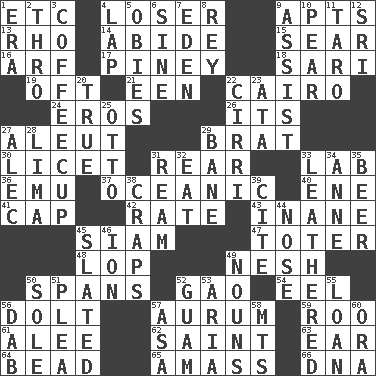 ACROSS 1. And so on (abbr.) 4. Failure 9. Tenement units (abbr.) 13. 17th letter of the Greek alphabet 14. Tolerate 15. Singe 16. Sandy's bark 17. Abounding in pines 18. Indian skirt 19. Often (poetically) 21. Car or cant ending 22. Capital of Egypt 24. Greek god of love 26. ___ a Wonderful Life 27. Eskimo relative 29. Naughty child 30. It is permitted: Lat. 31. Tail end 33. Experiment locale 36. Australian flightless bird 37. Pertaining to the sea 40. Compass dir. 41. Head covering 42. Pace 43. Silly 45. Thailand, formerly 47. Carrier 48. Chop off 49. Tender 50. Connects, as a bridge 52. E Mali city 54. Snakelike fish 56. Dunce 57. Gold (Symbol: Au) 59. Friend of Pooh 61. Toward shelter 62. Inhabitant of Heaven 63. Ewer handle 64. Necklace unit 65. Collect or gather 66. Heredity factor (abbr.) DOWN 1. Epoch 2. Through, poetically 3. Java holder (2 wds.) 4. Infant locale 5. Off-Broadway awards 6. Trig term 7. Genesis locale 8. Marina Del _, California 9. Aid 10. Lightbulb-shaped fruit 11. Pacific island yam 12. Indian title of respect (Mr.) 20. Loyal 22. High-altitude cloud 23. "One Day ___ Time" 25. Von Bismarck 27. Actor Baldwin 28. Pale green bean 29. Object of repulsion 31. 480, 500 or 516 sheets of paper 32. Erode 33. Resembling or made to resemble leather 34. Queen of England 1702-14 35. Fermented drink made from hops 38. Dice game 39. Quote 44. Olfactory organ 45. Scheduled 46. Electrically charged atom 49. Parts of speech 50. Flatfish 51. Entreaty 52. Island territory of the United States 53. Roberta Peters solo 55. Grant temporary use of 56. Pat or tap gently 57. White ___ sheet 58. Mountains (abbr.) 60. Mouth or opening