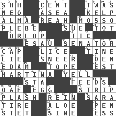 ACROSS 1. Quiet! 4. Penny 8. It was, poetically 12. Modern: prefix 13. Toward the sea 14. Seaweed 15. _ mater 17. 480, 500 or 516 sheets of paper 18. With motion or animation 19. First-year military academy student 21. Institute legal proceedings 23. Small child 24. Fourth or lowest deck 26. Nervous spasm 28. Son of Isaac 30. Elected representative 34. Head covering 37. Louse (plural) 39. Prong on a fork 40. Falsehood 41. Scornful expression 43. Lair 44. Dutch treat 46. Drink excessively 47. Eastern Standard Time (abbr.) 48. Chrissie's court nemesis 51. Shout 54. R.R. building 55. Eats 58. Clumsy lout 61. Ovum 63. Empty completely 65. Suffix with ecto or cyto 67. It's straight from the horse's mouth 71. "Two Mules for Sister ____" 72. Hoop that covers a wheel 73. _ vera 74. Writing instrument 75. Proofreading order 76. Trig term 77. Double-curved letter DOWN 1. Fastener 2. Phone greeting 3. Homing pigeon 4. Automobile 5. Compass dir. 6. Teachers' org. 7. Scottish caps 8. Ring climax 9. Compass direction 10. In addition 11. Blemish 16. Competent 18. Chow _ 20. Greek goddess of the dawn 22. Shoshoni 25. Friends 27. Feline 29. National forest in Provo, Utah 30. Oozy 31. Event that recurs at intervals 32. Washington bills 33. Monthly bill 34. Clement's nick name 35. Opera by Verdi 36. Lightbulb-shaped fruit 38. Corporate head (abbr.) 42. Coral ridge 45. Mountains (abbr.) 49. A distinct part 50. Tired old horse 52. French article 53. Allows 56. Window treatment 57. Founders of families 58. Chooses 59. Set down 60. Conductor's collection 62. Pate de foie ____ 64. Baking dishes 66. Arrange properly for use 68. Connecticut Ivy Leaguer 69. Electrically charged atom 70. Born