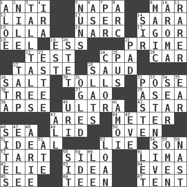 ACROSS 1. Against 5. California wine valley 9. Make imperfect 12. One who doesn't tell the truth 13. One who makes use of a thing 14. "Two Mules for Sister ____" 15. Spanish pot 16. Drug cop 17. Russian composer Stravinsky 18. Snakelike fish 19. Curvy letter 21. First class 22. Trial 24. Numbers guy (abbr.) 26. Auto 27. Clothes sense 28. Saudi Arabian king (1953-1964) 29. Table seasoning 30. For Whom the Bell _____ 32. Airs 36. Woody plant 37. E Mali city 38. At sea 39. Domed church section 40. Extremist 42. Play the lead 43. Ancient Greek god of war 44. Distance measurement 46. Ocean 49. Hat (slang) 50. Baking chamber 51. Perfect 53. Falsehood 54. Manchild 57. Small pie 58. Grain storage tower 61. Pale green bean 62. Writer Wiesel 63. It may be bright or harebrained 64. Nights before holidays 65. Observe 66. Adolescent 67. Portable shelter DOWN 1. _ vera 2. "Death on the ____" 3. Baron Munchausen's specialties 4. Lyricist Gershwin 5. Religious women 6. White ___ sheet 7. For each 8. Curve 9. Mysterious quality of enchantment 10. Scent 11. Less widely known 14. Title for a knight 19. Eastern Standard Time (abbr.) 20. Proofreading order 21. Writing tablet 23. First name in cosmetics 24. Bodily heat indicating an inflammation 25. Festering 27. Canvas cover 28. Narrow boards 29. R.R. building 31. Stared at amorously 32. Thick mixture 33. Clearly or manifestly demonstrative 34. Shrivel 35. Hearing organ 40. RI univ. 41. Mine, in Marseilles 43. 100% 45. Night before a holiday 46. Locates 47. Peak District village in England 48. Nest on high 52. Had dinner 53. Grant temporary use of 55. Sign of things to come 56. Political cartoonist Thomas 58. Be seated 59. Binary compound 60. Area sheltered from the wind 61. Allow