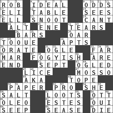 ACROSS 1. Director Reiner 4. Perfect 9. Likelihood 13. Biblical high priest 14. Eating place 15. Observes 16. Pipe bend 17. Snout, nose 18. Patter 19. Keyboard modifier key 21. Compass dir. 22. Pulls apart 24. Taverns 26. Boat paddle 27. Woman's close-fitting hat 29. Tenement units (abbr.) 30. Declaim 31. Stare 33. Distant 36. Make imperfect 37. Out of fashion; old fashioned 40. "We ___ not amused" (Victoria) 41. Conclude 42. Back-to-school mo. 43. Stared at amorously 45. Louse (plural) 47. With motion or animation 48. Alias (abbr.) 49. Drink excessively 50. Some stationery 52. Adept person 54. A female animal or person 56. Table seasoning 57. Plunders 59. Baseball player Mel 61. Butter sub 62. _____ Park, CO 63. Fr. "Yes" 64. Ooze 65. Gospel singer Marvin 66. Pass on DOWN 1. Portuguese money of account (variant) 2. Spanish pot 3. Big road sign 4. It is 5. Natives or inhabitants of Denmark 6. Inky black, to poets 7. _ vera 8. Allow 9. Motion picture awards 10. Letter starter 11. Hiding places for outlaws 12. Fast jet (abbr.) 20. Drawn tight 22. Drinks excessively 23. Erode 25. Coral collection 27. Heavy book 28. NW Algerian seaport 29. Set down 31. Double curve, resembling the letter S 32. Flimflam 33. It jiggles the polygraph 34. Ancient Greek god of war 35. Make new 38. Witty Wilde 39. Like (prefix) 44. Republicans 45. Portable computer 46. Mamie's husband 49. Hauls 50. Diluted with white 51. Toward shelter 52. Introduce or present, as a question 53. Round or rotation of duties 55. Needle case 56. Mayday 57. French article 58. Compass dir. 60. Standoff