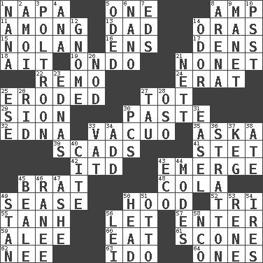 ACROSS 1. California wine valley 5. Single 8. Electrical Unit 11. Amid 13. Male parent 14. Mouths or openings 15. Pitcher Ryan 16. Followers of ems 17. Hiding places for outlaws 18. Small island 19. Southwest Nigerian state 21. Music written for nine 22. San ____ (Riviera town) 24. Part of Q.E.F. 25. Eaten away 27. Small child 29. The Jewish people; Israel 30. Thick mixture 32. Pulitzer Prize-winning author Ferber 33. In a vacuum (with "in") 35. "____ silly question..." 39. Loads 41. Proofreading order 42. It would 43. Develop 45. Naughty child 48. Root beer relative 49. Gospel singer Marvin 50. Parka part 52. Three (prefix) 55. Hyperbolic tangent 56. Allow 57. Keyboard key 59. Toward shelter 60. Consume 61. Biscuitlike quick bread 62. Born 63. Wedding promise 64. Washington bills DOWN 1. Nanny 2. Mine, in Marseilles 3. Characterized by complete cowardliness 4. Santa ___, CA 5. Wrote a lyric poem 6. Billionth: prefix 7. Begley and Asner 8. Sports stadium 9. French painter Edouard 10. Inconspicuous attention getter 12. Dwarf 14. Aroma 20. Lower and raise head in agreement 21. Remaining after all deductions 23. Ferber et al. 25. Compass dir. 26. To free from 27. The 19th letter of the Greek alphabet 28. Bear (Spanish) 30. Personal Computers (abbr.) 31. Artist's stand 33. Large container 34. Increase 36. Ski resort town in Vermont 37. Cask 38. Had dinner 40. Quote 43. Environmental prefix 44. Methods 45. Calif. Air Force Base 46. The wife of a rajah (variant) 47. American tennis player Robert 49. Comedian Laurel of Laurel & Hardy 50. Froth on beer 51. "Beetle Bailey" pooch 53. French philosopher Descartes 54. Angers 56. Flowery wreath 58. Non-commissioned officer (abbr.)