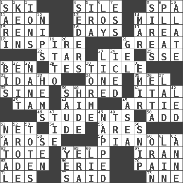 ACROSS 1. What Jean-Claude Killy likes to do 4. Drop; flow; fall 8. Health resort 11. A really long time 13. Greek god of love 14. Place where flour is made 15. Painter Guido (1575-1642) 16. 24-hour periods 17. Length times width 18. Heighten or intensify 21. Relatively large 22. Play the lead 23. Whopper 25. Compass dir. 26. Benjamin's nick name 29. A testis 32. Potato state 34. Single 35. Cartoonist voice _ Blanc 38. Trig term 39. Tear up 41. Slanted text style (abbr.) 43. Scottish cap 44. Direct toward a target or goal 45. Nick name for Arthur 46. SAT takers 50. Find the sum of 51. Fish or hair follower 54. Binary compound 55. Ancient Greek god of war 57. Came up 59. Player piano 63. Carryall 64. Sharp bark 67. SW Asia republic 68. An important port of Yemen 69. 4th largest of the Great Lakes 70. Ache 71. French article 72. Alleged 73. Compass dir. DOWN 1. Indian skirt 2. Peachy ____! 3. Charged particles 4. Spring feasts 5. Lyricist Gershwin 6. Myrna of the movies 7. Double-curved letter 8. Male parents of animals 9. Entreaties 10. Having winglike extensions 12. Cuts off 14. Spoil 19. "Tell ____ the Marines!" 20. Actress Charlotte 21. Set 23. Actor's bit 24. On the rocks 26. Twice 27. Prepare for publication 28. Grandmother 30. Singer Mel 31. Independent ruler or chieftain 33. Folds over and sews together 36. Singer James 37. Put down 39. Saudi Arabian king (1953-1964) 40. Flintstone garb 42. Directed 45. At sea 47. Neckwear 48. Slept 49. Three (prefix) 51. Brizilian seaport 52. Eat (away) 53. Lugs 56. Clip 58. Elected rep. 60. NW Algerian seaport 61. (Had) reclined 62. Singer Murray 64. It is so 65. Epoch 66. Cards in a Roman deck?