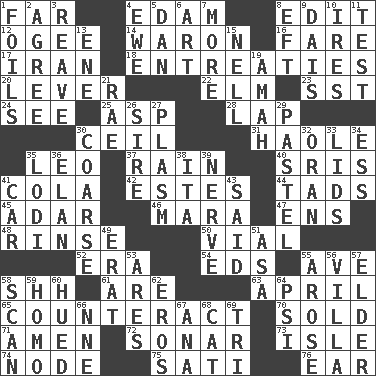ACROSS 1. Distant 4. Dutch treat 8. Prepare for publication 12. Double curve, resembling the letter S 14. Make _____ (do battle with) 16. Conductor's collection 17. SW Asia republic 18. Pleas 20. Crowbar 22. Shade tree 23. Fast jet (abbr.) 24. Observe 25. Cleo's killer 28. Pet locale 30. To provide with a ceiling 31. White Person, in Hawaii 35. Lion 37. Water falling in drops from the sky 40. Indian titles of respect 41. Root beer relative 42. _____ Park, CO 44. Small amounts or degrees 45. The sixth month of the Jewish calendar 46. Hindu Mythology: god of death 47. Followers of ems 48. Wash lightly 50. Small bottle 52. Period 54. Begley and Asner 55. "___ Maria" 58. Quiet! 61. "We ___ not amused" (Victoria) 63. Showery time 65. Act in opposition 70. Exchanged or delivered for money 71. So be it 72. Underwater navigation system 73. Small island 74. Thickened enlargement 75. Suttee (variant) 76. Hearing organ DOWN 1. Fencing necessities 2. Match 3. Rob, plunder, or pillage 4. She-sheep 5. Daniel's nick name 6. Tate display 7. Greater amount 8. Newt 9. Raised platform 10. Angers 11. Trial 13. Compass dir. 15. 1994 drama film starring Jodie Foster 19. Housemaid 21. Actress Charlotte 26. The founder of a family 27. Suffix with ecto or cyto 29. Soft color 30. Unrefined 32. NW Algerian seaport 33. Hats (slang) 34. Double-curved letter 35. Farming town in central California 36. Liveliness 38. Call ___ day 39. Effrontery 41. Automobile 43. Stated 49. Part of Q.E.F. 51. White ___ sheet 53. Ancient Greek god of war 55. Came up 56. Country residence 57. A person who is older than you are 58. Examine hastily 59. Same (prefix) 60. Became colored 62. Greek god of love 64. Air pressure measure (abbr.) 66. Compass dir. 67. Santa ___, CA 68. Domesticated feline 69. Three (prefix)