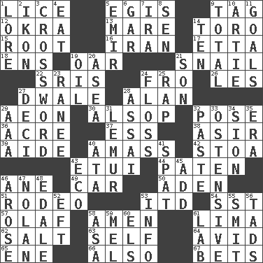 ACROSS 1. Louse (plural) 5. Armor plate that protects the chest 9. Label 12. Gumbo ingredient 13. Female horse 14. "Corrida" creature 15. Carrot, for example 16. SW Asia republic 17. Singer James 18. Followers of ems 19. Boat paddle 21. Slow-paced one 22. Indian titles of respect 24. From 26. French article 27. A sleeping potion; an opiate (poet.) 28. Actor Alda or Thicke 29. Period of immesurable duration 30. Columnist Joseph or Stewart 32. Airs 36. 1/640 square mile 37. Curvy letter 38. SW Saudi Arabia district 39. Assistant 40. Collect or gather 42. Portico 43. Needle holder 44. Eucharist need 46. One (Scot) 49. 4-wheeled motor vehicle 50. Arabian gulf 51. Cowboy competition 53. It would 54. Fast jet (abbr.) 57. Norwegian king 58. So be it 61. Pale green bean 62. Table seasoning 63. Automatically 64. Enthusiastic 65. Compass dir. 66. In addition 67. Wagers DOWN 1. Old wives' tales, e.g. 2. Picture 3. What you're doing now 4. Erode 5. Arab leader 6. Slender fish 7. Retirement account (abbr.) 8. Elected rep. 9. Add up to 10. Nick name for Arthur 11. Scores awarded for successful feats 14. "___ Little Indians" 19. Petroleum 20. Toward the sea 21. Boy, to dad 23. The wife of a rajah (variant) 24. Soft thread for cleaning between teeth 25. Reproach for some lapse or misdeed 27. Tenth: prefix 28. Slender Brazilian palm 29. Auto club (abbr.) 31. Arboreal primate 32. Thick mixture 33. Clearly or manifestly demonstrative 34. The Jewish people; Israel 35. Epoch 40. _ moment's notice (2 wds.) 41. Argument over a trivial matter 43. Environmental prefix 45. Find the sum of 46. Came up 47. Pitcher Ryan 48. Peak District village in England 52. Bank Draft (abbr.) 53. Information 55. Stricken, poetically 56. Small amounts or degrees 58. White ___ sheet 59. Cartoonist voice _ Blanc 60. Raised railways 61. Experiment locale