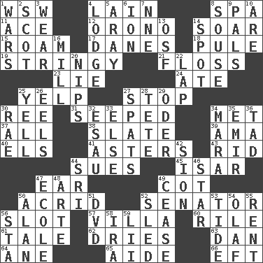 ACROSS 1. Compass dir. 4. (Had) reclined 8. Health resort 11. Adept person 12. U. of Maine site 14. Fly high 15. Wander 17. Natives or inhabitants of Denmark 18. Whine 19. Slender, wiry 21. Soft thread for cleaning between teeth 23. Untruth 24. Had dinner 25. Sharp bark 27. Close up, plug up 30. To riddle 31. Oozed 34. Was introduced to 37. Everything 38. Schedule 39. Housemaid (var.) 40. Raised railways 41. Michaelmas daisies 43. To free from 44. Takes to court 45. Austrian river, tributary to the Danube 47. Hearing organ 49. Small bed 50. Bitter 52. Legislator 56. Narrow, elongated depression 57. Country residence 60. Cause heat under the collar 61. Story 62. Frees from moisture 63. Daniel's nick name 64. A saturated hydrocarbon 65. Helper 66. Newt DOWN 1. Armed conflicts 2. Native of Scotland 3. Erode 4. Inn 5. Like ___ of sunshine 6. Electrically charged atom 7. Compass dir. 8. Lush 9. Friends 10. "We ___ not amused" (Victoria) 13. Order of Saint Francis (abbr.) 14. Specific locale 16. Place where flour is made 20. Pinches, bites 22. Infant locale 25. Shout 26. Snakelike fish 27. Arguments over trivial matters 28. False hair 29. Baltic tributary 30. Actress Charlotte 32. Son of Isaac 33. Otherwise 34. Hindu Mythology: god of death 35. Arab leader 36. Small amount or degree 42. The Jewish people; Israel 44. _ Lanka 46. Play the lead 47. Learning spot: Fr. 48. Johnson of "Laugh-In" 49. Stop 50. ____ Jay Lerner 51. Movie disc 52. Downhill vehicle 53. Event that recurs at intervals 54. Norwegian king 55. Monthly bill 56. R.R. building 58. Lyricist Gershwin 59. Cards in a Roman deck?