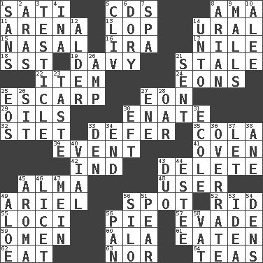 ACROSS 1. Suttee (variant) 5. Music discs 8. Wet nurse (var.) 11. Sports stadium 13. Trim (branches) 14. Mountain range 15. Relating to the nose 16. Retirement account (abbr.) 17. "Death on the ____" 18. Fast jet (abbr.) 19. _ Jones' Locker 21. Having lost freshness 22. A whole individual unit 24. Immeasurably long periods of time 25. Fortification 27. Period of immesurable duration 29. Lubricates 30. Maternal 32. Proofreading order 33. Postpone 35. Root beer relative 39. Incident 41. Baking chamber 42. Indiana (abbr.) 43. Keyboard key 45. _ mater 48. One who uses or employs something 49. Satellite of Uranus 50. Specific locale 52. To free from 55. Venues 56. Sliced dessert 57. Elude 59. Presage 60. Chicken ___ king 61. Consumed 62. Erode 63. Not either 64. Afternoon social gatherings DOWN 1. Without 2. Ancient river in northeast Turkey 3. A testis 4. _ tizzy (2 wds.) 5. 154 in Roman numerals 6. Dinghy 7. Health resort 8. Believer in; advocate of (suffix) 9. Promenades 10. Toward shelter 12. Tree or shrub in the Birch family 14. To (old English) 20. Electrical Unit 21. Posted 23. Clothes sense 25. Greek goddess of the dawn 26. Be seated 27. Compass dir. 28. Rowing implement 30. Bank Draft (abbr.) 31. Learning spot: Fr. 33. Lair 34. Conclude 36. Make much ado about nothing 37. Allow 38. One (Scot) 40. Small bottle 43. Superhero pair 44. First name in cosmetics 45. Scent 46. It is permitted: Lat. 47. Chow _ 49. _ vera 50. Grain storage tower 51. Lightbulb-shaped fruit 53. The main thing one is thinking about 54. Lairs 56. Baking dish 58. Large container