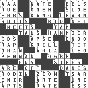 ACROSS 1. Auto club (abbr.) 4. Nathan's nickname 8. Snakelike fish 12. Sorrow 13. Presage 14. _ gin 15. Blunders 17. Mild oath, euphamism for damn 18. Acquire or gain knowledge or skills 19. Sets of matching outer garments 21. River (Sp.) 23. Fish or hair follower 24. Confronts 26. Scottish cap 28. Bits 30. More overdramatic by comparison 34. Music discs 37. Domed church section 39. Inside; within (prefix) 40. Strike 41. The principal food of baleen whales 43. Teat (slang) 44. Northwest Algerian city 46. Operatic vocal solo 47. Lion 48. Pre-World Series prize 51. Legendary monster 54. Followers of ems 55. Fathers 58. "We ___ not amused" (Victoria) 61. Often (poetically) 63. Natives or inhabitants of Denmark 65. "The Thinker" sculptor 67. The Jewish people; Israel 71. Russian ruler of old 72. Independent ruler or chieftain 73. Johnson of "Laugh-In" 74. Single; one (prefix) 75. Tenement units (abbr.) 76. Pace 77. Double-curved letter DOWN 1. Ancient Greek god of war 2. Gold (Symbol: Au) 3. Nest on high 4. Lower and raise head in agreement 5. Housemaid (var.) 6. Nine, plus one 7. Engineer (abbr.) 8. Compass dir. 9. Style 10. Old wives' tales, e.g. 11. Posted 16. Proofreading order 18. Rich soil 20. R.R. building 22. Call ___ day 25. Neighbor of Neb. 27. Madame (abbr.) 29. Small fatty European fish 30. Sun: prefix 31. International (abbr.) 32. Singer Brickell 33. Printing process, for short 34. Riding implement 35. Have the gumption 36. Connect, as a bridge 38. Title for a knight 42. Falls behind 45. Compass dir. 49. Soon (poet.) 50. Overdraft (abbr.) 52. To free from 53. Part of Q.E.F. 56. Follow as a consequence or result 57. Actors Connery and Penn 58. Length times width 59. Play 60. Prepare for publication 62. Czar 64. Indian titles of respect 66. Big collection agency 68. Lyricist Gershwin 69. Baseball player Mel 70. Born