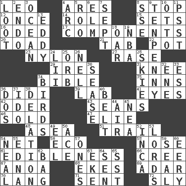 ACROSS 1. Lion 4. Ancient Greek god of war 8. Constrict 12. At one time in the past 14. Hero or heavy, e.g. 15. Puts into a specified state 16. Wrote a lyric poem 17. Pieces 20. Frog relative 21. Keyboard key 22. Cooking vessel 23. High-strength synthetic material 27. Raze (variant) 29. Angers 31. Leg joint 34. Instruction Manual for Humans 35. Lodging establishments 36. "You Light Up My Life" star Conn 39. Experiment locale 41. Sight organs 42. Baltic tributary 43. Actors Connery and Penn 46. Exchanged or delivered for money 47. Writer Wiesel 48. Toward the sea 51. Lag or linger behind 54. Fish or hair follower 56. Environmental prefix 58. Sense of smell 61. The property of being fit to eat 66. Algonquian 67. Small Philippine buffalo 68. Supplements with great effort 69. The sixth month of the Jewish calendar 70. Austrian-born American filmmaker Fritz 71. Emitted 72. Insidious DOWN 1. Plunder 2. Inside; within (prefix) 3. Sea 4. Curve 5. Friend of Pooh 6. Shade tree 7. Back-to-school mo. 8. Compass dir. 9. 3-inch nail 10. Von Bismarck 11. Inconspicuous attention getter 13. Whirlpool 18. Boat paddle 19. Basketball assoc. 24. Cards in a Roman deck? 25. Globe 26. 1994 drama film starring Jodie Foster 28. Atmospheres 30. Gospel singer Marvin 32. Compass dir. 33. Double-curved letter 34. Avian creatures 36. Two (Sp.) 37. Wedding promise 38. Conveyance 40. Waist strap 44. Wind 45. Teachers' org. 49. Snakelike fish 50. Adept person 52. South American Indian 53. Domineers 54. Be tempered by heat 55. Pulitzer Prize-winning author Ferber 57. Singles 59. Lick closed 60. Suggestive of the supernatural 62. Container for groceries 63. Supplement with great effort 64. Elected rep. 65. Fast jet (abbr.)