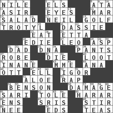 ACROSS 1. The longest river in the world 5. Raised railways 8. _ moment's notice (2 wds.) 11. SW Saudi Arabia district 12. Sight organs 14. Third mo. 15. Vegetable dish 17. Famous astronaut Armstrong 18. _ course 19. Trinitrotoluene 21. Small ungulate mammals of Africa 23. Consume 25. Singer James 26. Singer Brickell 27. Lion 28. Cleo's killer 31. Male parent 33. Heredity factor (abbr.) 35. Leg coverings 37. Loose flowing garment 38. Expire 40. Spoils 41. Lacking in sense or substance 43. Madame (abbr.) 45. Santa ___, CA 46. Baseball player Mel 47. Pipe bend 50. Composer Stravinsky 52. _ vera 53. Strike 54. Gillaume's butler role 56. Break 61. Indian skirt 62. Lacquered or enameled metalware 65. Ethiopian city, capital of Harari 66. Followers of ems 67. Indian titles of respect 68. Agitate 69. Born 70. Begley and Asner 71. Beverages made from leaves DOWN 1. Political cartoonist Thomas 2. Austrian river, tributary to the Danube 3. _ and Stitch 4. Part of Q.E.F. 5. Car or cant ending 6. Potassium hydroxide 7. A glass for beer 8. Mine, in Marseilles 9. Falsehood 10. Sandy's bark 13. Schedule 16. Colored 18. Girls' org. (abbr.) 20. Put down 22. Close up, plug up 24. Watch over 26. Paradise 28. Soon (poet.) 29. Portico 30. Pacific Standard Time (abbr.) 31. Do not 32. Blind as ____ 34. Direct toward a target or goal 36. Having or resembling wings 37. River (Sp.) 39. Independent ruler or chieftain 42. Snakelike fish 44. Mild oath 48. Plunders 49. Poe poem 51. Brightly colored fish 52. Black tropical American cuckoo 54. Object of repulsion 55. Celtic language 57. Vertical spar for supporting sails 58. Johnson of "Laugh-In" 59. Greek goddess of the earth (variant) 60. Blunders 61. Elected rep. 63. Flaplike covering 64. Curvy letter