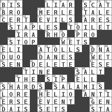 ACROSS 1. Again 4. One who doesn't tell the truth 8. Go away! 12. Sis' sibling 13. Haggard of country music 14. Lie 15. Certainty 17. Vices 18. Ancient Greek god of war 19. Paper fasteners 21. Bathroom 23. Lyricist Gershwin 24. 17th letter of the Greek alphabet 26. Adept person 27. Obstruct or block passage 28. Moistens 30. Biblical high priest 31. Ringlike coral islands and reefs 34. Heredity factor (abbr.) 37. Superhero pair 38. Natives or inhabitants of Denmark 39. Dripping 40. Elected rep. 41. Erase 42. Compass dir. 43. Prong on a fork 44. Table seasoning 46. Definite Article 47. Small drink 50. Pipe bend 51. Broken pieces 54. Deli grouping 57. Old wives' tales, e.g. 58. Sun: prefix 60. Opposed to 62. Celtic language 63. Happening 64. Commissioned military rank (abbr.) 65. Raised platform 66. Puts into a specified state 67. R.R. building DOWN 1. English channel? 2. Angers 3. Conclusion 4. Prying instrument 5. From or relating to Ireland 6. Everything 7. State of inaction 8. Flight of steps 9. Monte _, Las Vegas Hotel/Casino 10. Toward shelter 11. Trial 13. Cartoonist voice _ Blanc 16. Pacific island yam 20. Infant food 22. Chooses 25. A small or young owl 27. Change direction abruptly 29. Otherwise 30. Begley and Asner 31. An important port of Yemen 32. Falsehoods 33. Single 34. Homes 35. A home for chicks 36. Had dinner 41. Passed on 43. Trios 44. Ocean 45. _ mater 46. Tarsus (plural) 48. Small island 49. Aches 51. Downhill vehicle 52. Israeli folk dance 53. "______ My Girl" (Turtles hit) 55. Car dealer's back yard 56. Proofreading order 59. First lady 61. _ tizzy (2 wds.)