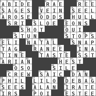 ACROSS 1. Tolerate 6. Actress Charlotte 9. To separate or throw off 12. Gurus 13. Distinctive style or manner 14. Sew up the eyelids of hawks and falcons 15. Came up 16. Probability 17. Frame or body of a ship 18. _ Lanka 19. _ gin 20. Immeasurably long periods of time 21. Went for two points 23. Fr. "Yes" 24. Make senseless or dizzy 25. Halts 28. Biblical high priest 30. Relating to or accompanying birth 34. Fastener 35. Label 36. Indian princess (variant) 38. _ tizzy (2 wds.) 39. Prong on a fork 41. Clothes sense 43. Fast jet (abbr.) 44. Believer in; advocate of (suffix) 46. Behest 48. Bear (Spanish) 49. Filth; sediment 50. Group working together 51. Ketch in the Levant 53. Daniel's nick name 56. Silvers or Donahue 57. _ and Stitch 58. Debunk (Brit. slang) 60. Observes 61. Actor Alda or Thicke 62. Feeling or showing extreme anger 63. Big collection agency 64. Luau course 65. First name in cosmetics DOWN 1. White ___ sheet 2. Soap units 3. Composer Stravinsky 4. Cease 5. Compass dir. 6. Redecorate 7. Assistant 8. Followers of ems 9. One who advocates reunion 10. Snakelike fish 11. Pipe bend 13. Electrical Unit 14. Yells 19. Underwater navigation system 20. Greek goddess of the dawn 22. Attila the _ 24. Seigniories (variant) 26. Baking dishes 27. Petty quarrel 28. Singer James 29. Den 31. Make lace 32. Santa ___, CA 33. French article 37. Value system 40. Artist's stands 42. Snakelike fish 45. Immediately 47. Spring feasts 49. The Jewish people; Israel 50. "Mermaids" star 51. Grain storage tower 52. Mountain range southwest of Kyrgyzstan 54. Blind as ____ 55. Nathan's nickname 56. 23rd letter of the Greek alphabet 57. Infant locale 58. Pass on 59. Unit of force equal to gravity