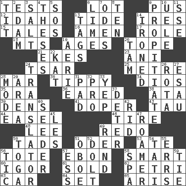 ACROSS 1. Trials 6. Car dealer's back yard 9. Tenth month of the Hindu calendar 12. Potato state 13. Event that recurs at intervals 14. Angers 15. Stories 16. So be it 17. Hero or heavy, e.g. 18. Mountains (abbr.) 19. Eras 20. Drink excessively 21. Makes supply last 23. Cuckoo 24. Russian ruler of old 25. Distance measurement (Brit.) 28. Make imperfect 30. Likely to tip or tilt 34. "Vaya con ____" 35. Mouth or opening 36. Having ears or earlike features 38. "One Day ___ Time" 39. Lairs 41. Drug addict 43. The 19th letter of the Greek alphabet 44. Artist's stand 46. Become fatigued 48. Area sheltered from the wind 49. Do over again 50. Bits 51. Baltic tributary 53. Had dinner 56. Carryall 57. Inky black, to poets 58. Don Adams' spy role 60. Russian composer Stravinsky 61. Disposed of to a purchaser 62. _ dish (used to culture cells) 63. Auto 64. Put into a specified state 65. Originate DOWN 1. Teat (slang) 2. Dutch treat 3. Table seasoning 4. College papers 5. Distress signal 6. Welles in "The Third Man" 7. Lyric poems 8. "___ Little Indians" 9. Conciliate 10. Ubangi River tributary 11. Compass dir. 13. Labels 14. Pressed 19. Nest on high 20. Scottish cap 22. Krazy ___ of comics 24. Interpreter 26. Round or rotation of duties 27. Son of Isaac 28. Method 29. Length times width 31. Writing tablet 32. Adept person 33. Slangy assent 37. Prevent from occurring 40. Sowing specialist 42. To free from 45. French article 47. Nomad 49. Tear apart 50. Ancient Roman robe 51. Mitch Miller's instrument 52. Stupid person 54. Jacques of French films 55. Blunders 56. Nervous spasm 57. Curvy letter 58. Health resort 59. Neckwear