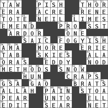 ACROSS 1. The 23rd letter of the Hebrew alphabet 4. Expression of disdain 8. Son of Odin 12. Period 13. 43,560 square feet 14. French philosopher Descartes 15. Carry 17. Famous astronaut Armstrong 18. Citrus fruits 19. Make improvements or corrections to 21. Adept person 23. Fast jet (abbr.) 24. Zeal 26. Single 28. Ketch in the Levant 30. Out of fashion; old fashioned 34. Nanny (var.) 37. Greater amount 39. One of the Great Lakes 40. Bar bill 41. Atmospheres 43. Chicken ___ king 44. Mouths or openings 46. Whirlpool 47. Allow head to fall sleepily 48. Modes 51. Overwhelm 54. Attila the _ 55. Dice game 58. Girls' org. (abbr.) 61. E Mali city 63. Naughty children 65. Assad's deity 67. Ache 71. Portico 72. Lightbulb-shaped fruit 73. To (old English) 74. Pipe bend 75. Prepare for publication 76. Wither 77. Fish or hair follower DOWN 1. Wig 2. Odor 3. Wetness 4. Baking dish 5. Frozen water 6. _ Lanka 7. Assist 8. Three (prefix) 9. Equivocates 10. Washington bills 11. Relief 16. Conclusions 18. Protracted 20. ___ good deed 22. Friend of Pooh 25. Basketball hoops 27. Sight organ 29. Popular sodas 30. Gives food to 31. SW Asia republic 32. Grain storage tower 33. Froth on beer 34. Smallest unit of an element 35. Female horse 36. Blind as ____ 38. To free from 42. Synchronize (abbr.) 45. Quiet! 49. Ending for "Through" and "Enough" 50. Heredity factor (abbr.) 52. Globe 53. Armed conflicts 56. Eucharist need 57. Took without asking 58. Open wide 59. Downhill vehicle 60. Mountain range southwest of Kyrgyzstan 62. Musical composition 64. Table seasoning 66. Nonscientific branch of learning 68. One (Scot) 69. Call ___ day 70. Not either
