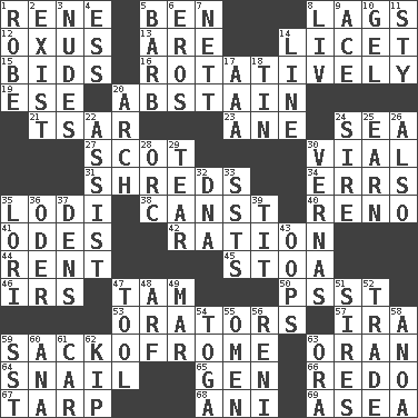 ACROSS 1. French philosopher Descartes 5. Benjamin's nick name 8. Straggles 12. Amu Darya 13. "We ___ not amused" (Victoria) 14. It is permitted: Lat. 15. Auction offers 16. Happening in regular succession 19. Compass dir. 20. Choose not to consume 21. Russian ruler of old 23. One (Scot) 24. Ocean 27. Highlander 30. Small bottle 31. Fragments 34. Blunders 35. Farming town in central California 38. 2nd pers. sing. pres. of can (arch.) 40. Western Nevada city 41. Lyric poems 42. Food allowance for one day 44. Monthly bill 45. Portico 46. Big collection agency 47. Scottish cap 50. Inconspicuous attention getter 53. Speakers 57. Lyricist Gershwin 59. Italian handbag shop? 63. NW Algerian seaport 64. Slow-paced one 65. Commissioned mil. rank 66. Make new 67. Canvas cover 68. Cuckoo 69. At sea DOWN 1. Loose flowing garment 2. Have an existence 3. Unclothed pictures 4. Curvy letter 5. Sharp remark 6. Greek god of love 7. Remaining after all deductions 8. 54 in ancient Rome 9. Adept person 10. Set 11. Filthy place 14. Actor's bit 17. American Automobile Association (abbr.) 18. Metal container 20. Bowlike part 22. Aid 24. Male parent of an animal 25. Merit 26. In addition 28. The grampus (Milton) 29. Pull apart 30. Actresses Bloom and Felton 32. Heredity factor (abbr.) 33. Fast planes 35. Australian parrot (variant) 36. River in Europe 37. Hiding places for outlaws 39. Teat (slang) 43. I made a mistake 47. Utensil 48. Sandy's bark 49. Third mo. 51. Begets 52. Barter 54. Ancient Roman robe 55. Sign of something about to happen 56. Painter Guido (1575-1642) 58. Small Philippine buffalo 59. Fast jet (abbr.) 60. Santa ___, CA 61. Auto 62. Sleep 63. Mouth or opening