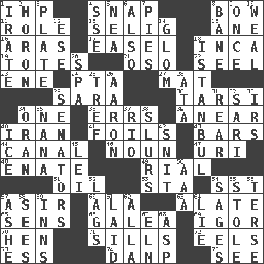 ACROSS 1. Naughty child 4. Fastener 8. Arrow shooter 11. Hero or heavy, e.g. 13. Former Milwaukee Brewers owner Bud 15. One (Scot) 16. Ancient river in northeast Turkey 17. Artist's stand 18. South American Indian 19. Lugs 21. Bear (Spanish) 22. Sew up the eyelids of hawks and falcons 23. Compass dir. 24. Parent Teacher Assoc. 27. Floor protector 29. "Two Mules for Sister ____" 30. Tarsus (plural) 34. Single 36. Blunders 39. Approach 40. SW Asia republic 41. Fencing necessities 43. Oblong pieces of solid material 44. Lessep's creation 46. Part of speech 47. RI univ. 48. Maternal 49. Monetary unit of Yemen 51. Lubricate 53. R.R. building 54. Fast jet (abbr.) 57. SW Saudi Arabia district 60. Insect wing 63. Having winglike extensions 65. Elected reps. 66. An organ shaped like a helmet 69. Composer Stravinsky 70. Layer 71. Beverly of Met fame 72. Snakelike fish 73. Double-curved letter 74. Moist 75. Perceive with the eye DOWN 1. Feeling or showing extreme anger 2. Person of subnormal intelligence 3. Food holder 4. Compass dir. 5. Teachers' org. 6. In addition 7. Sliced desserts 8. Object of repulsion 9. At one time in the past 10. Welt 12. Compass dir. 14. Take by theft 18. Byzantium, centuries later 20. Health resort 25. Not kosher 26. Composer Copland 28. _ moment's notice (2 wds.) 29. Elected representatives 31. Stern 32. Indian skirt 33. Big collection agency 34. NW Algerian seaport 35. Grandmother 37. _ de Janeiro 38. Plays smoothly or legato 40. Frozen water 42. In a ____ (agitated or irritated) 45. Luau accessory 50. American Automobile Association (abbr.) 52. Falls behind 54. Gurus 55. Took without asking 56. Laconic 57. American tennis player Robert 58. Perceives with the eye 59. Restaurants 61. Put down 62. Silent film actress Nazimova 64. Untruth 67. Shade tree 68. Viper