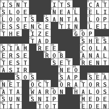 ACROSS 1. Is not 5. It is 8. Feline 11. A type of plum 12. Anneal 14. Connecticut Ivy Leaguer 15. Plunders 17. Before Barbara or Clara 18. Trim (branches) 19. Substance 21. Metal container 22. Flowery wreath 23. Definite Article 24. Ending with capital 25. Grand Old Party 27. Bit 28. "______ My Girl" (Turtles hit) 31. Thailand, formerly 35. To sift 37. Root beer relative 38. Celtic language 39. Director Reiner 41. Of or related to the anus 42. Trial 43. Arrange properly for use 45. Monthly bill 46. SW Saudi Arabia district 47. Modern: prefix 49. Mayday 51. Plant excrement 52. Ocean 55. Fish or hair follower 57. Sep. follower 60. Speakers 62. "One Day ___ Time" 63. Make _____ (do battle with) 65. Rings 66. Player for Phoenix 67. Sever or remove by pinching or nipping 68. Ancient Persian 69. Teat (slang) 70. Small child 71. Locale of original sin DOWN 1. Small island 2. Make a splashing sound 3. Trap for birds or small mammals 4. False hair 5. _ tizzy (2 wds.) 6. Portable shelter 7. Suttee (variant) 8. Portable communications device 9. _ vera 10. Native american tent (variation) 13. Long (Scottish) 16. In a ____ (agitated or irritated) 17. Sowing specialist 20. Russian ruler of old 26. Witty Wilde 29. Style 30. Table seasoning 31. Stalk of a moss capsule 32. Angers 33. Helper 34. Paris' subway 36. Greek goddess of the dawn 40. Gillaume's butler role 44. Lacerate 48. Brightly colored fish 50. Sty mamas 52. Having a sole or soles 53. Wear away 54. NE Netherlands city 55. Political cartoonist Thomas 56. Needle case 58. Patter 59. Musical group of three 61. Not wild 64. Elect
