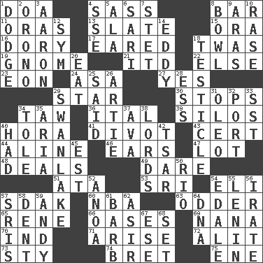 ACROSS 1. ___ good deed 4. Backtalk 8. Drinking establishment 11. Mouths or openings 13. Schedule 15. Mouth or opening 16. Dinghy 17. Having ears or earlike features 18. It was, poetically 19. Dwarf 21. It would 22. Otherwise 23. Age 24. White ___ sheet 27. Affirmative reply 29. Play the lead 30. Constricts 34. The 23rd letter of the Hebrew alphabet 36. Slanted text style (abbr.) 39. Grain storage towers 40. Israeli folk dance 41. A piece of turf (Scot.) 43. An absolute certainty 44. Place in a line 46. Hearing organs 47. Car dealer's back yard 48. Allots cards 49. Have the gumption 51. _ moment's notice (2 wds.) 53. _ Lanka 54. Biblical high priest 57. Neighbor of Neb. 60. Basketball assoc. 63. More peculiar 65. French philosopher Descartes 66. Fertile tracts in a desert 69. Grandmother 70. Indiana (abbr.) 71. Ascend 72. Came down and settled, as after flight 73. Filthy place 74. Cy Young winner Saberhagen 75. Compass dir. DOWN 1. Evade 2. U. of Maine site 3. Composer Copland 4. Compass dir. 5. In the manner of 6. Indian skirt 7. Proofreading order 8. Soup holder 9. Caspian sea tributary 10. Raze (variant) 12. Symbol (abbr.) 14. Whirlpool 18. One of the two male reproductive glands 20. Consume 25. Stated 26. Nick name for Arthur 28. Double-curved letter 29. Tchaikovsky ballet 31. Butter sub 32. Sweet dark-red dessert wine 33. Fast jet (abbr.) 34. Lacquered or enameled metalware 35. Roberta Peters solo 37. Actress Gardner 38. Nobles 40. Possessed 42. Russian ruler of old 45. Eastern Standard Time (abbr.) 50. _ de Janeiro 52. Small Philippine buffalo 54. Peak District village in England 55. Soviet premier 1918-24 56. Feeling or showing extreme anger 57. Indian titles of respect 58. Incision 59. Actor Griffith 61. Sharp remark 62. SW Saudi Arabia district 64. Heredity factor (abbr.) 67. Compass dir. 68. Put into a specified state