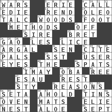 ACROSS 1. Armed conflicts 5. One of the Great Lakes 9. Give a ring to 13. Singer Brickell 14. Tear apart 15. Margarine 16. Baby powder 17. Forest 18. 12 inches 19. Modes 21. No longer planned or scheduled 22. Beget 23. Cy Young winner Saberhagen 24. E Mali city 27. French article 28. Louse (plural) 29. Therefore, facetiously 31. Elected rep. 32. Quote 36. Friends 37. Fast jet (abbr.) 38. One who uses or employs something 39. Sight organs 40. Definite Article 41. Arguments over trivial matters 42. "If ____ say so..." 44. Chief or king in Benin or Nigeria 46. Portuguese money of account (variant) 47. Son of Isaac 48. Respite 50. Filthy place 51. Thinks logically 54. Stalk of a moss capsule 56. Hold, grip (Informal) 58. Metal containers 60. Baking chamber 61. Floor protectors 62. Writer Wiesel 63. Egg locale 64. Medicinal plant 65. Back-to-school mo. DOWN 1. Soggy 2. First of billions? 3. Cause heat under the collar 4. Religious groups 5. Eats (away) 6. Vintage cars 7. Indiana (abbr.) 8. Begley and Asner 9. Java holder (2 wds.) 10. At or to great height 11. Lion 12. Car dealer's back yard 17. Had on 20. Land elevation 21. The grampus (Milton) 23. Storage container 24. Stare wonderingly 25. Like ___ of sunshine 26. Stare 28. Allow 30. Aide 31. Compass dir. 33. Austrian river, tributary to the Danube 34. False hair 35. Celtic language 37. Like a shrinking violet 40. The 19th letter of the Greek alphabet 41. Backtalk 43. Can I? 44. Threatening words 45. Necklace unit 47. _____ Park, CO 49. Lugs 51. Printing process, for short 52. Mediterranean tributary 53. Sever or remove by pinching or nipping 54. Male offspring 55. Night before a holiday 56. Nanny (var.) 57. Actor Linden 59. Put into a specified state