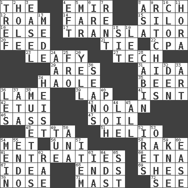 ACROSS 1. Definite Article 4. Arab leader 8. Bowlike part 12. Wander aimlessly 14. Conductor's collection 15. Grain storage tower 16. Otherwise 17. Interpreter 20. Nourish 21. Make a knot 22. Tax preparer (abbr.) 23. Like summer trees 27. Technical work 29. Ancient Greek god of war 31. Opera by Verdi 34. White Person, in Hawaii 35. Fermented drink made from hops 36. Unable to walk 39. Infant locale 41. Is not 42. Needle case 43. Pitcher Ryan 46. Backtalk 47. Earth 48. Singer James 51. Sun: prefix 54. Was introduced to 56. University (slang) 58. Immoral or dissolute person 61. Pleas 66. Inactive volcano in Sicily 67. The main thing one is thinking about 68. Conclusions 69. "______ My Girl" (Turtles hit) 70. Sense of smell 71. Vertical spar for supporting sails 72. Perceive with the eye DOWN 1. Not kosher 2. Hollow 3. Artist's stand 4. Bank Draft (abbr.) 5. Make imperfect 6. Lyricist Gershwin 7. Monthly bill 8. White ___ sheet 9. Actors Guy, Robert Welles, and Clint 10. Hoof sound 11. Israeli folk dance 13. Ancient Persian 18. Be seated 19. Area sheltered from the wind 24. Auto club (abbr.) 25. From 26. Shout 28. Apartment or room in a ship 30. Seines 32. Lair 33. Tate display 34. Robbery 36. French article 37. "One Day ___ Time" 38. French bagpipes 40. "Silly old bear" 44. Falsehood 45. 100% 49. Third day of the wk. 50. Santa ___, CA 52. Angers 53. Profane or obscene expressions 54. Count _ (2 wds.) 55. Inside; within (prefix) 57. Detail 59. Leg joint 60. Relaxation 62. Actress Charlotte 63. _ tizzy (2 wds.) 64. Begley and Asner 65. Fast jet (abbr.)