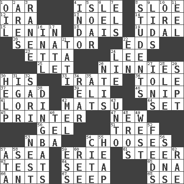 ACROSS 1. Rowing implement 4. Capri or Wight 8. _ gin 12. Lyricist Gershwin 13. Christmas carol 14. Hoop that covers a wheel 15. Soviet premier 1918-24 18. Raised platform 19. Freehold land 20. Elected representative 22. Begley and Asner 23. Singer James 24. Area sheltered from the wind 25. Allow 26. Fools 30. Part of HMS, perhaps 33. Feeling or showing extreme anger 36. Lacquered or enameled metalware 37. Mild oath 39. Connecticut Ivy Leaguer 40. Sever or remove by pinching or nipping 41. Australian parrot (variant) 42. Taiwanese island in East China Sea 44. Arrange properly for use 45. Hard copy producer 47. ___ Haven, CT 50. Set 51. Unclean, religiously 53. Basketball assoc. 54. Opts 57. At sea 59. 4th largest of the Great Lakes 61. Bull 63. Trial 64. Stalk of a moss capsule 65. Heredity factor (abbr.) 66. Pismires 67. Ooze 68. Compass dir. DOWN 1. Petroleum 2. Ancient Greek god of war 3. Indian princess (variant) 4. _ china 5. Fly high 6. Flowery wreath 7. Raised railways 8. SAT takers 9. Flaplike coverings 10. Mouth or opening 11. Snakelike fish 16. International (abbr.) 17. Nathan's nickname 21. Jacques of French films 22. Car or cant ending 24. Untruth 26. Nuclear Threat Initiatives 27. Charged atoms 28. Writer Wiesel 29. Back-to-school mo. 30. Aid 31. Composer Stravinsky 32. Indian skirt 34. Bring up, as a child 35. The first octave above the treble staff 38. Empty-headed or silly people 42. Cartoonist voice _ Blanc 43. To (old English) 46. Beverage made from leaves 48. Greek god of love 49. 270 degrees 52. Eats 53. A home for chicks 54. Quote 55. Pile 56. Elected reps. 57. _ moment's notice (2 wds.) 58. Elected rep. 59. Curvy letter 60. To separate or throw off 62. Actress Charlotte