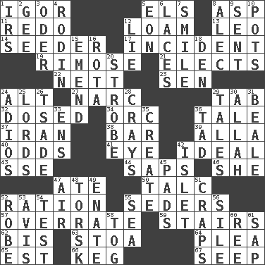ACROSS 1. Russian composer Stravinsky 5. Raised railways 8. Cleo's killer 11. Make new 12. Rich soil 13. Lion 14. Sowing specialist 17. Event 19. Full of chinks, cracks, or crevices 21. Chooses 22. Remaining after all deductions 23. Elected rep. 24. The first octave above the treble staff 27. Drug cop 29. Bar bill 32. Administered medicine 34. The grampus (Milton) 36. Falsehood 37. SW Asia republic 38. Long, evenly shaped piece 39. Silent film actress Nazimova 40. Probability 41. Sight organ 42. Standard of perfection 43. Compass dir. 44. Plant excrements 46. A female animal or person 47. Had dinner 50. Baby powder 52. Food allowance for one day 55. Spring feasts 57. Make much ado about nothing 59. Flight of steps 62. Again 63. Portico 64. Entreaty 65. Eastern Standard Time (abbr.) 66. Cask 67. Ooze DOWN 1. Big collection agency 2. Turn to the right 3. Baltic tributary 4. "The Thinker" sculptor 5. Period of immesurable duration 6. Shoestrings 7. Grin 8. Actor Baldwin 9. Posted 10. Cooking vessels 12. Falsehood 15. Make improvements or corrections to 16. Round or rotation of duties 18. Lair 20. Disco prop 24. Goodbye (Sp.) 25. Domineers 26. Sadhe (variant) 28. Trading vessels 29. Stories 30. Assad's deity 31. Memphis, Tenn. Street 33. Followers of ems 35. Cause to be 36. Small amount or degree 42. Small island 45. Groovy apts. 47. Wind 48. Cod relative 49. Related on the mother's side 51. Dice game 52. Loose flowing garment 53. Opinion 54. Trial 55. Ocean 56. Filth; sediment 58. Coat; cloak 60. To riddle 61. Plant excrement